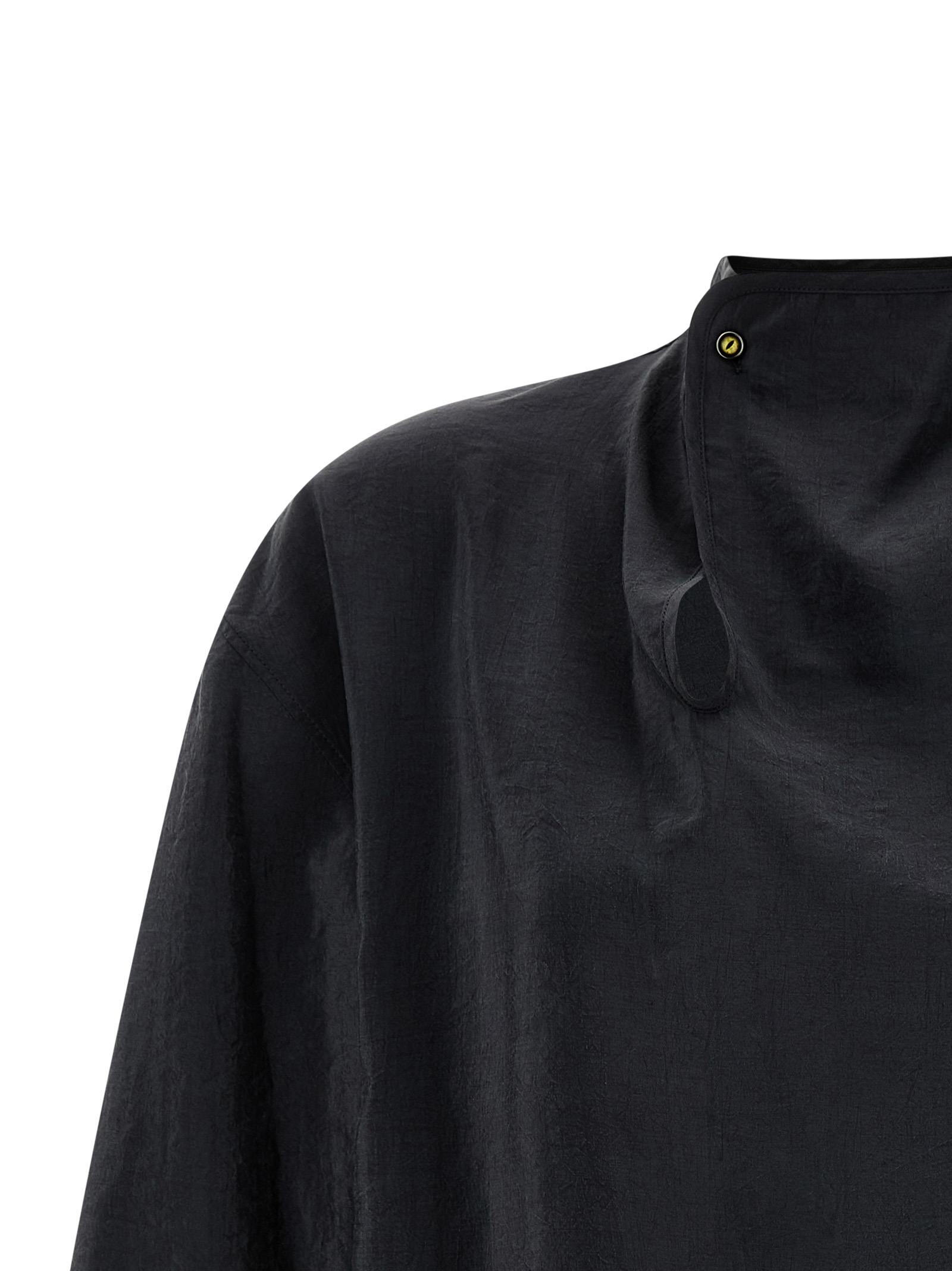 ‘soft collar’ slightly ruffled ‘dry’ silk blend top, Neckline with asymmetric closure with jewel button, Straight fit, Three-quarter wide sleeves.