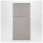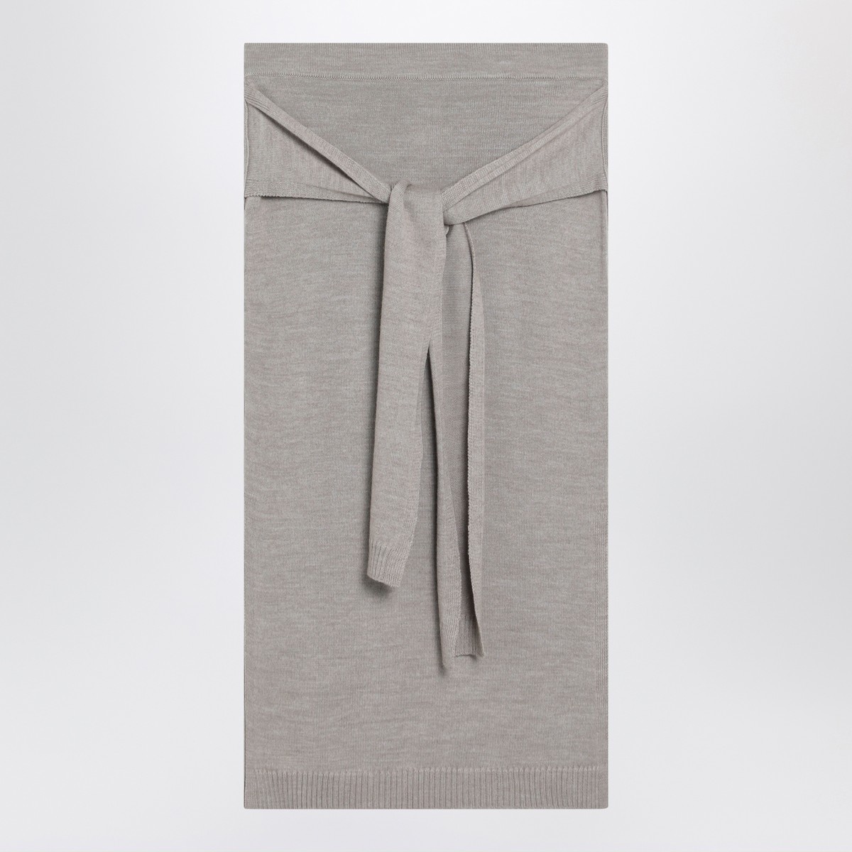 Skirt by Lemaire in taupe wool blend, featuring sweater-style tie panels, elastic waistband, side slits, and ribbed trims.