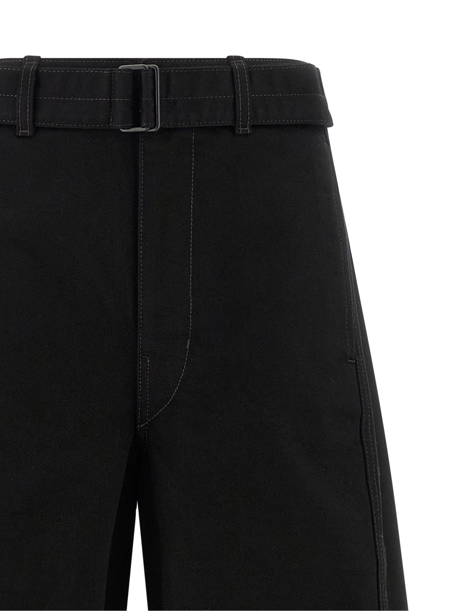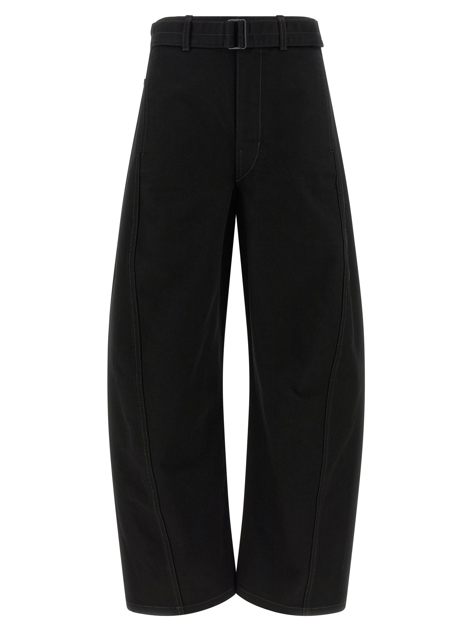 ‘Twisted Belted’ heavy cotton denim jeans, curved leg, mid waist, zip, hook and front button closure, pockets, removable belt.