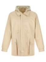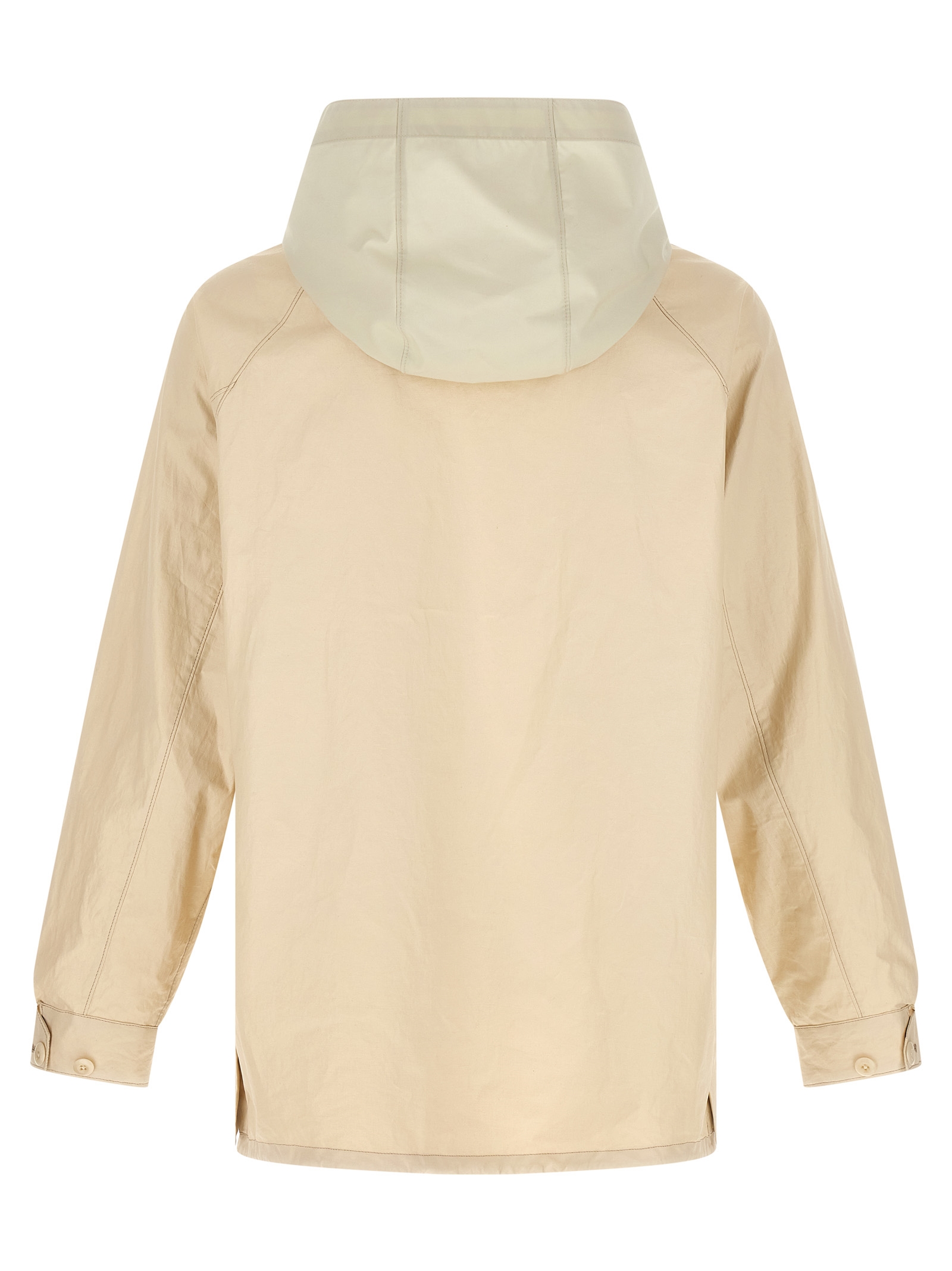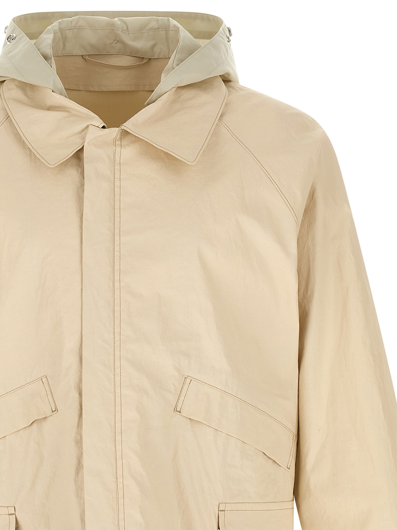 Waterproof jacket in coated technical linen with water-repellent treatment that gives a waxed and cracked effect, Removable hood in contrast fan® cotton, Shirt collar, Zip closure and hidden snap buttons on the front, Pockets, Long raglan sleeves with adjustable cuffs, Unlined.