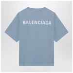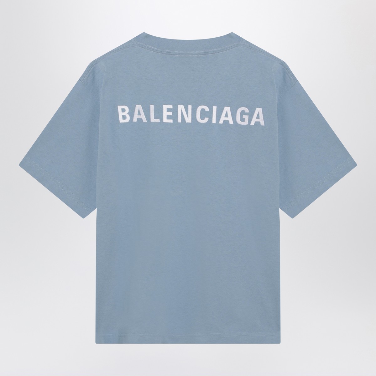 Light blue cotton jersey T-shirt by Balenciaga, featuring a ribbed crew neck, short sleeves, Balenciaga Back logo printed on the front and back and a Medium Fit.