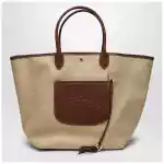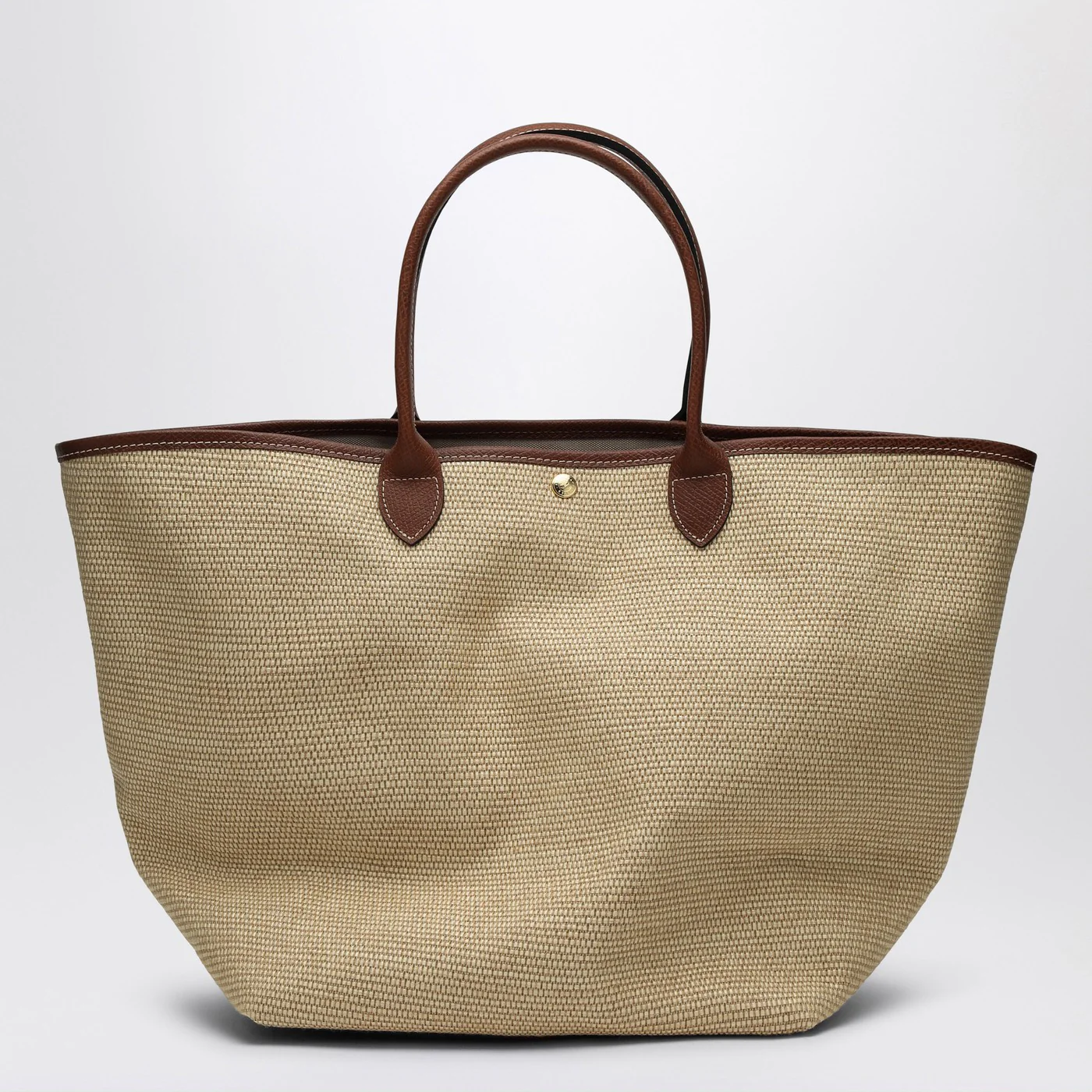 Basket bag by Longchamp in size L beige featuring brown leather details press stud fastening a removable and adjustable shoulder strap an external flat logoed pocket with Keychain and an internal zipped pocket. Size and Fit – Width 28 cm x Height 35 cm x Depth 20 cm Shoulder strap length 100 cm Handle drop: 17 cm