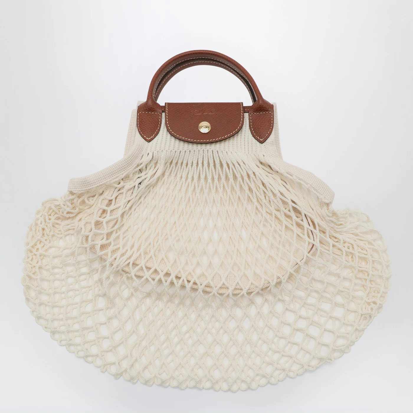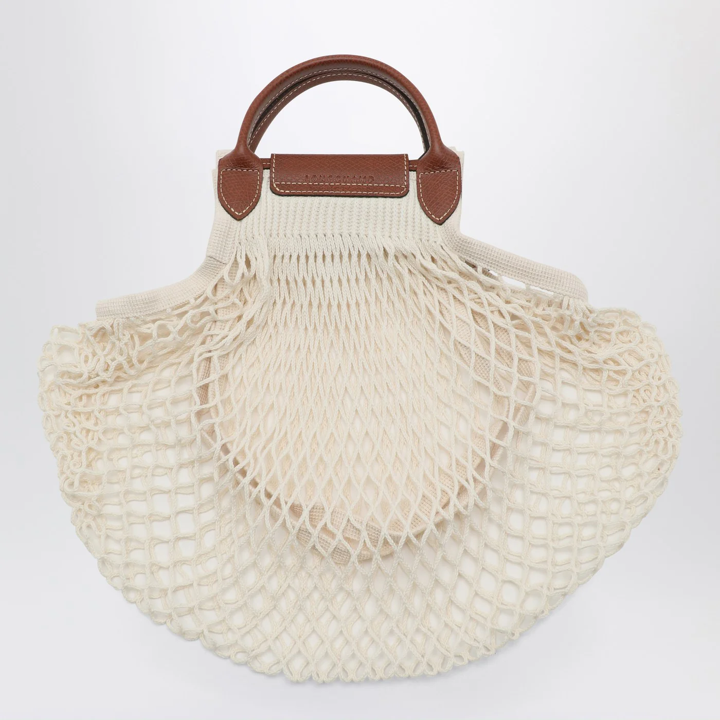 Small shoulder bag by Longchamp in ecru canvas crafted with open knit workmanship and brown leather featuring embossed logo to the front contrast stitching front press-stud fastening two rounded top handles and single shoulder strap. Size and Fit – Width 38 cm x Height 31 cm x Depth 0,5 cm Shoulder strap length 60 cm Handle drop: 6 cm