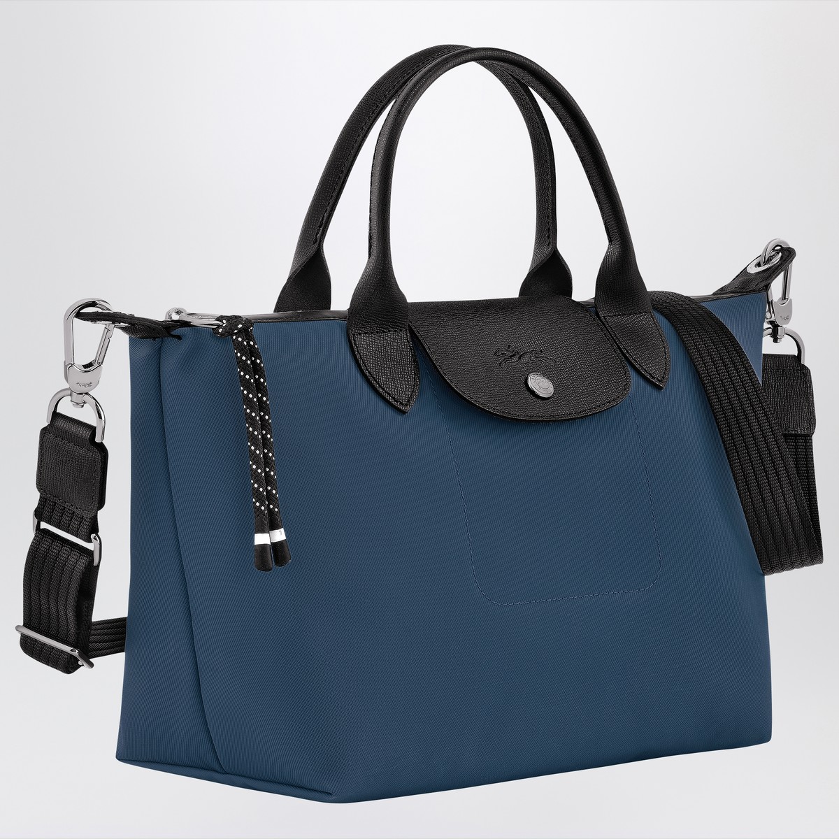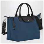 Small handbag by Longchamp in ink blue econyl recycled polyamide canvas, featuring two top handle, adjustable shoulder strap, foldover top with magnetic closure, zipper closure and main compartment.