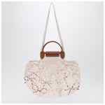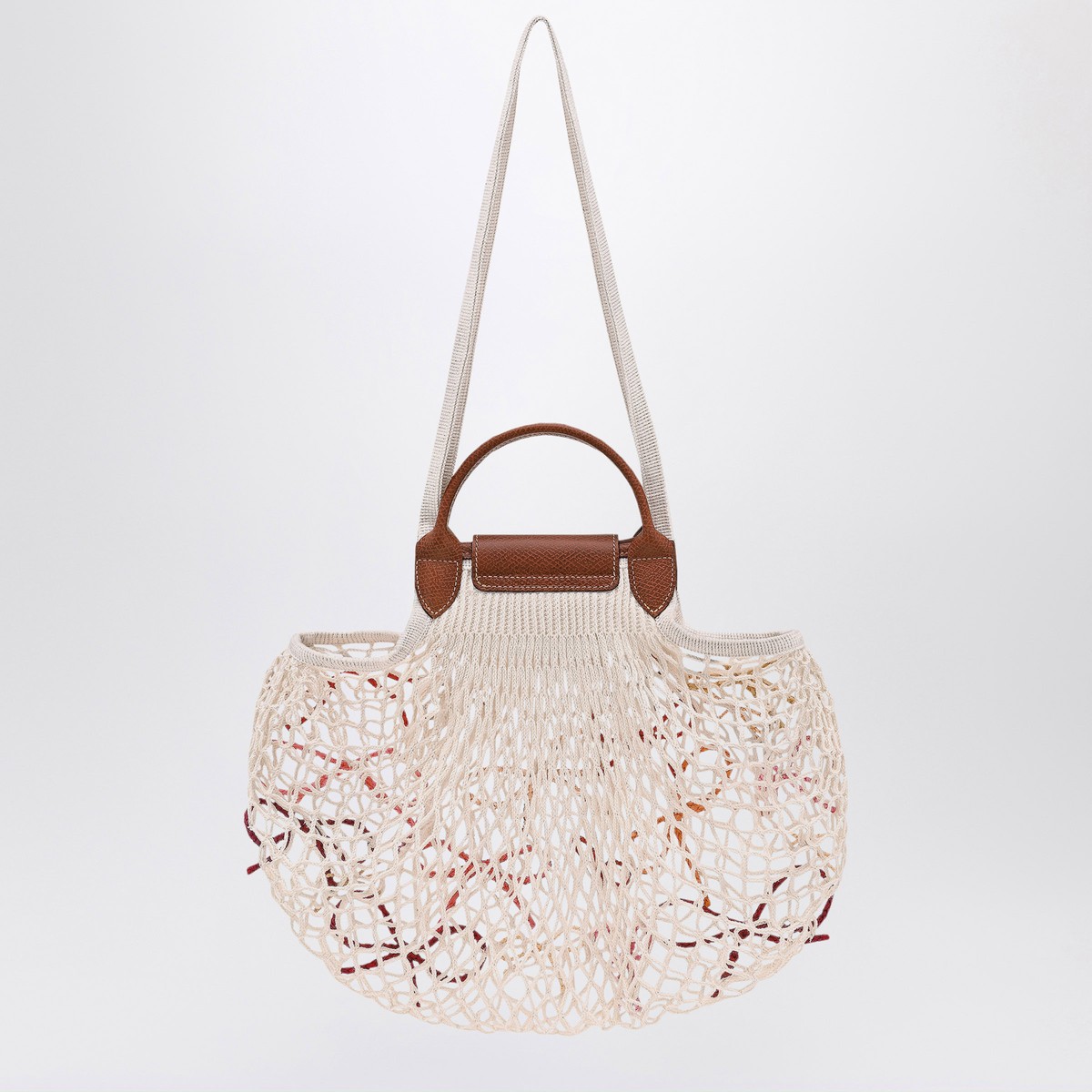 Longchamp bag in ecru mesh featuring coloured bow decoration, two fabric handles, leather flap and press stud closure.