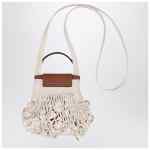Longchamp small bag in ecru mesh featuring coloured bow decoration, two fabric handles, leather flap and press stud closure.