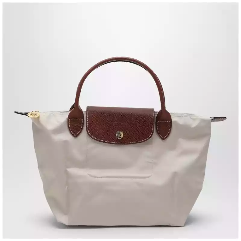 Small bag by Longchamp made of Paper coloured recycled polyamide with brown leather details featuring two top handles book closure with magnetic clasp zip fastening and main compartment. Size and Fit – Width 23 cm x Height 22 cm x Depth 14 cm Handle drop: 9 cm