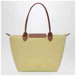 Medium bag by Longchamp made of pistachio coloured recycled polyamide canvas with brown leather details, featuring two top handles, book closure with magnetic clasp, zip fastening and main compartment.
