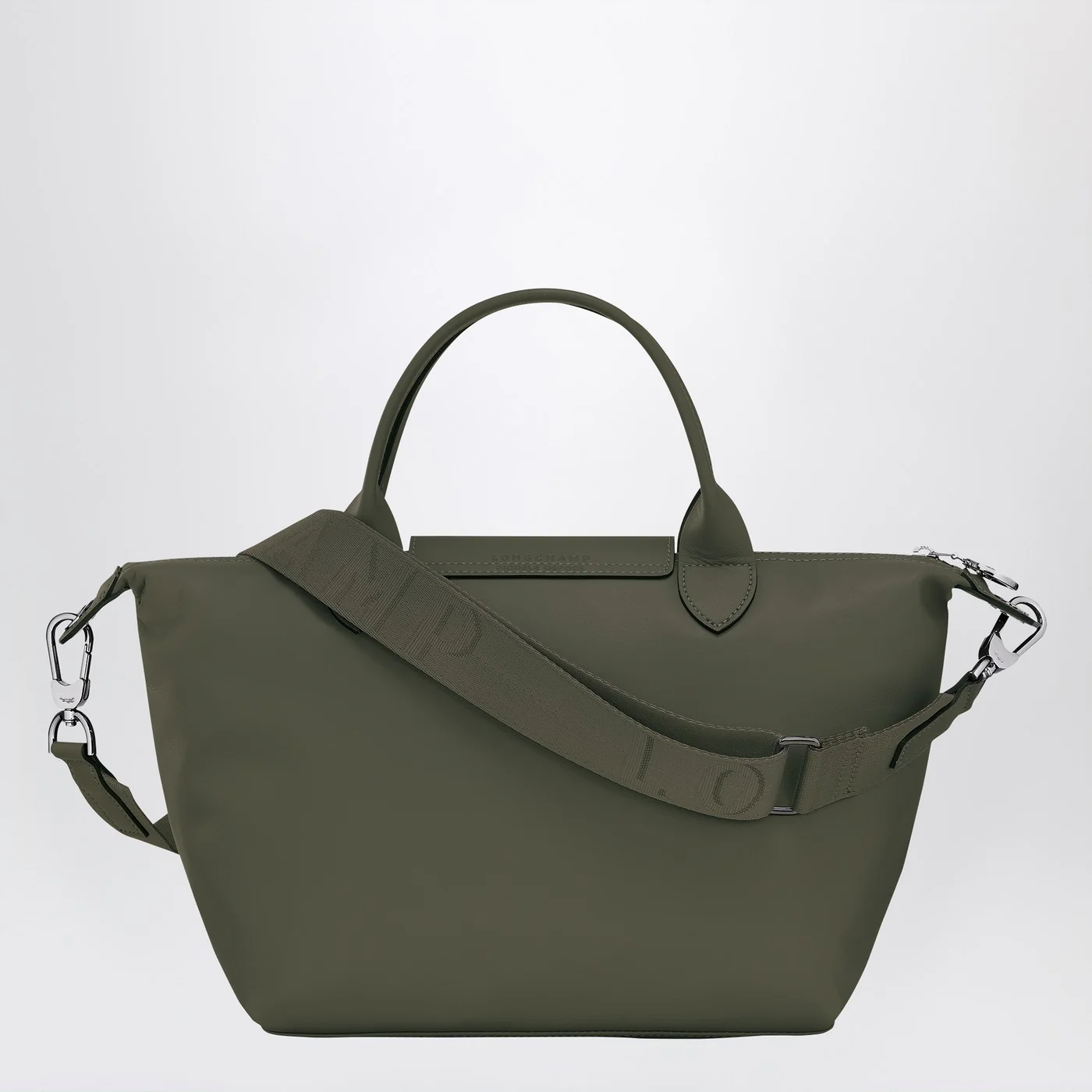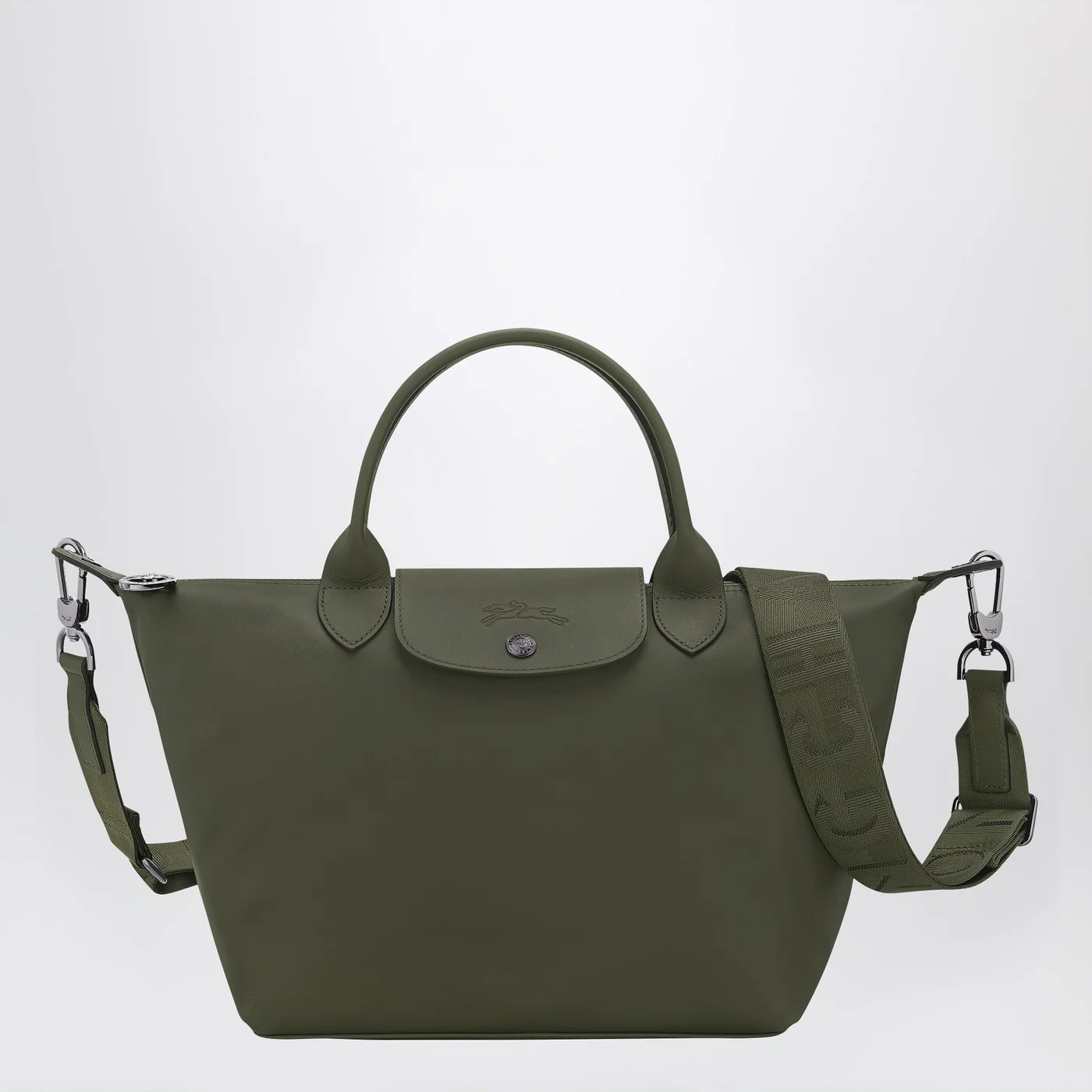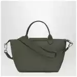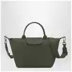 Sapin recycled polyamide Longchamp bag featuring a zip and snap button flap closure a removable and adjustable shoulder strap an internal flat pocket with zip and tone on tone embossed logo on the front. Size and Fit – Width 25 cm x Height 23 cm x Depth 16 cm Adjustable shoulder strap length min 70 cm – max 120 cm Handle drop: 12 cm