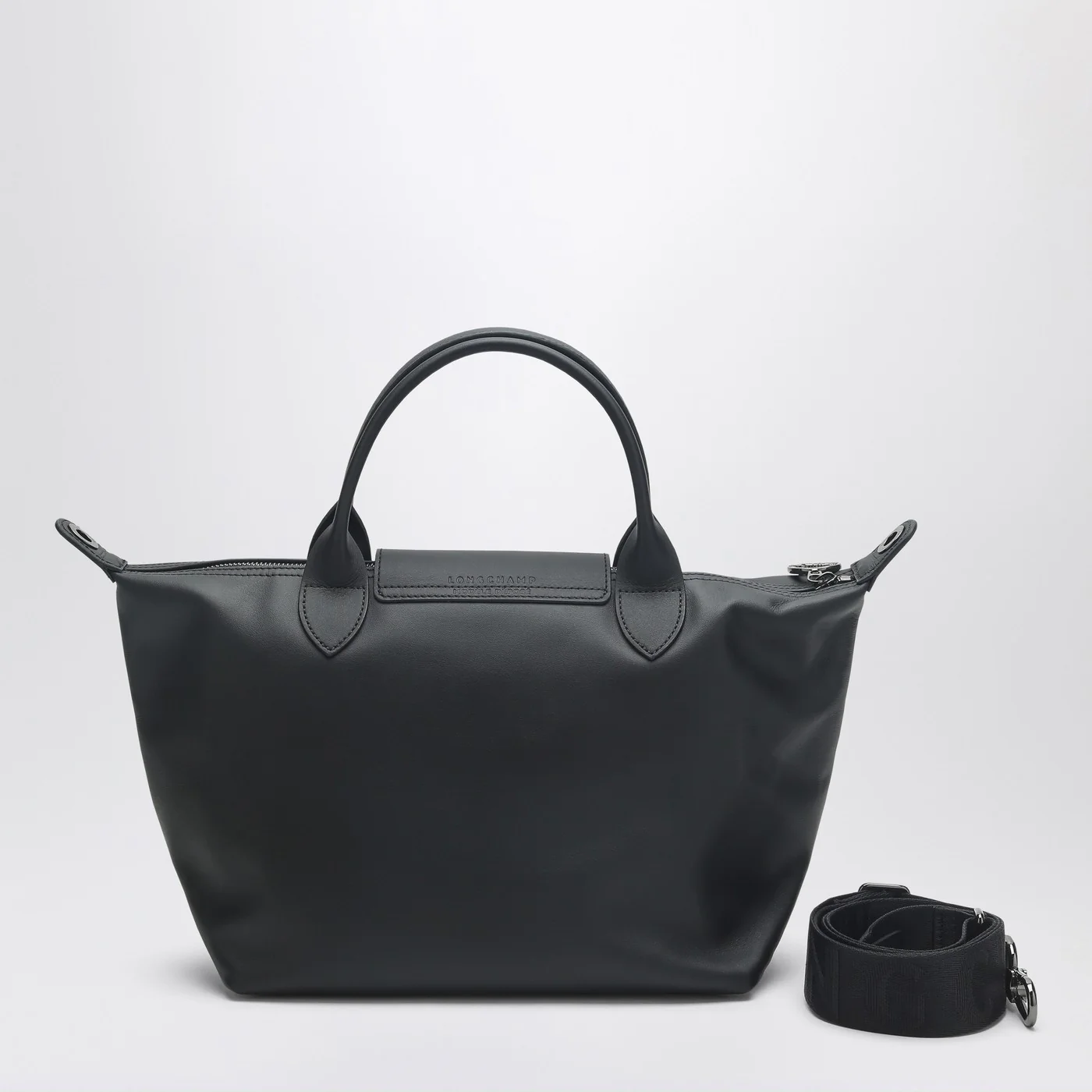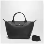 Black recycled polyamide Longchamp bag featuring a zip and snap button flap closure a removable and adjustable shoulder strap an internal flat pocket with zip and tone on tone embossed logo on the front. Size and Fit – Width 25 cm x Height 23 cm x Depth 16 cm Adjustable shoulder strap length min 70 cm – max 120 cm Handle drop 12 cm