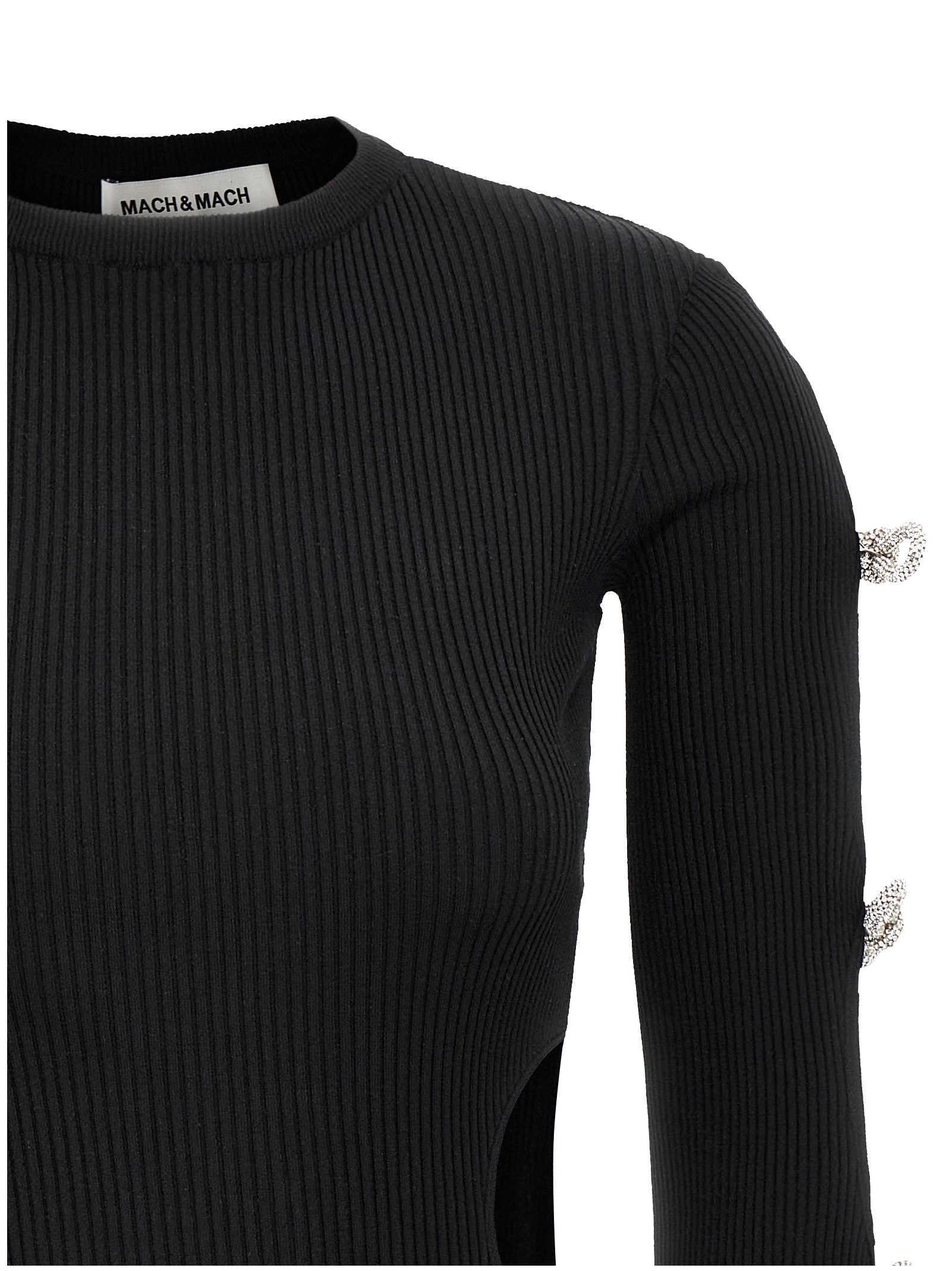 ‘Cut-Out Crystal Bow’ mini dress in stretch viscose blend with all-over cut-out details, crew neck, long sleeves with rhinestone bow decoration.