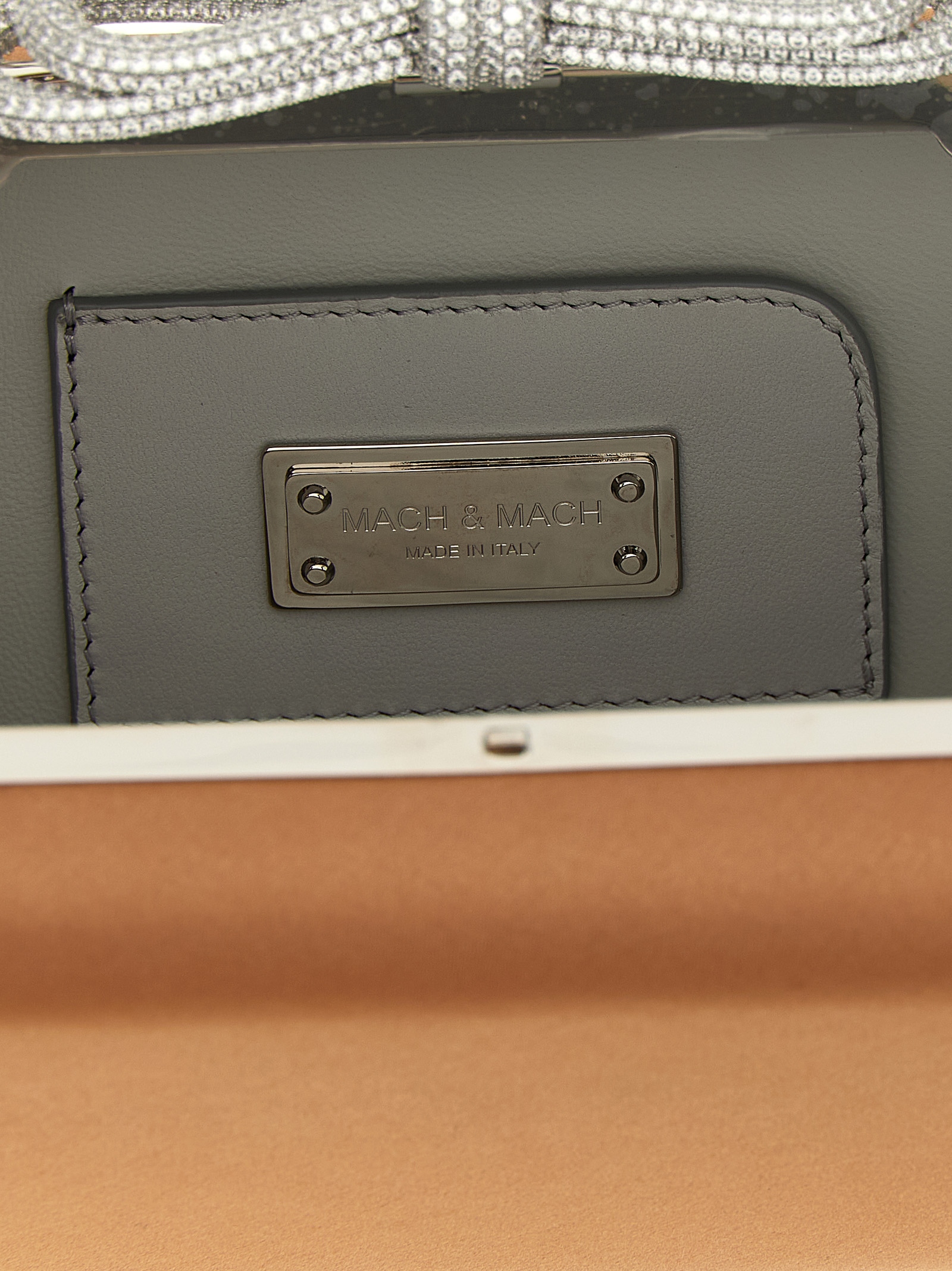 ‘Double Bow Satin’ satin clutch, metal closure with jewel bow application, removable chain shoulder strap.