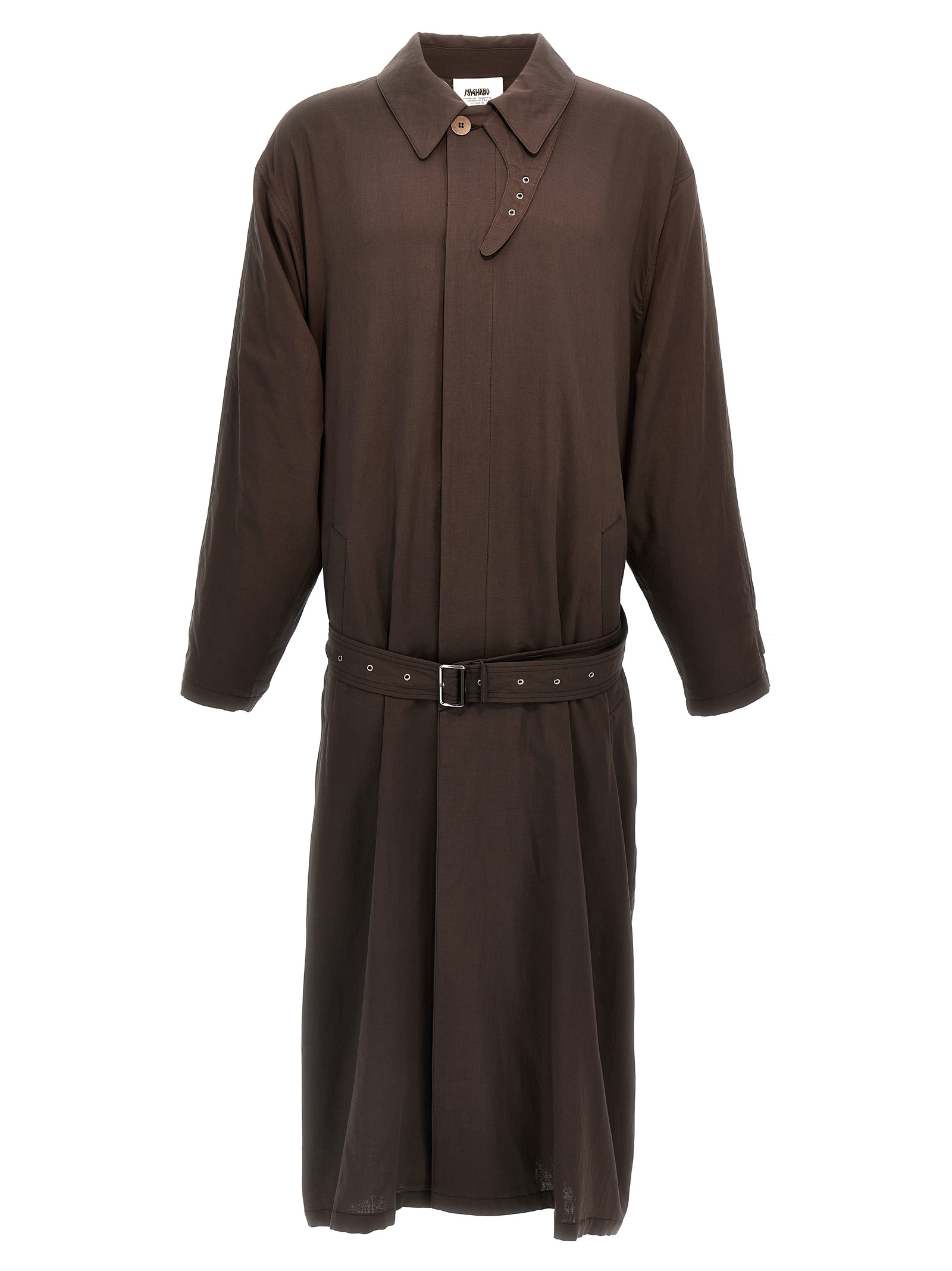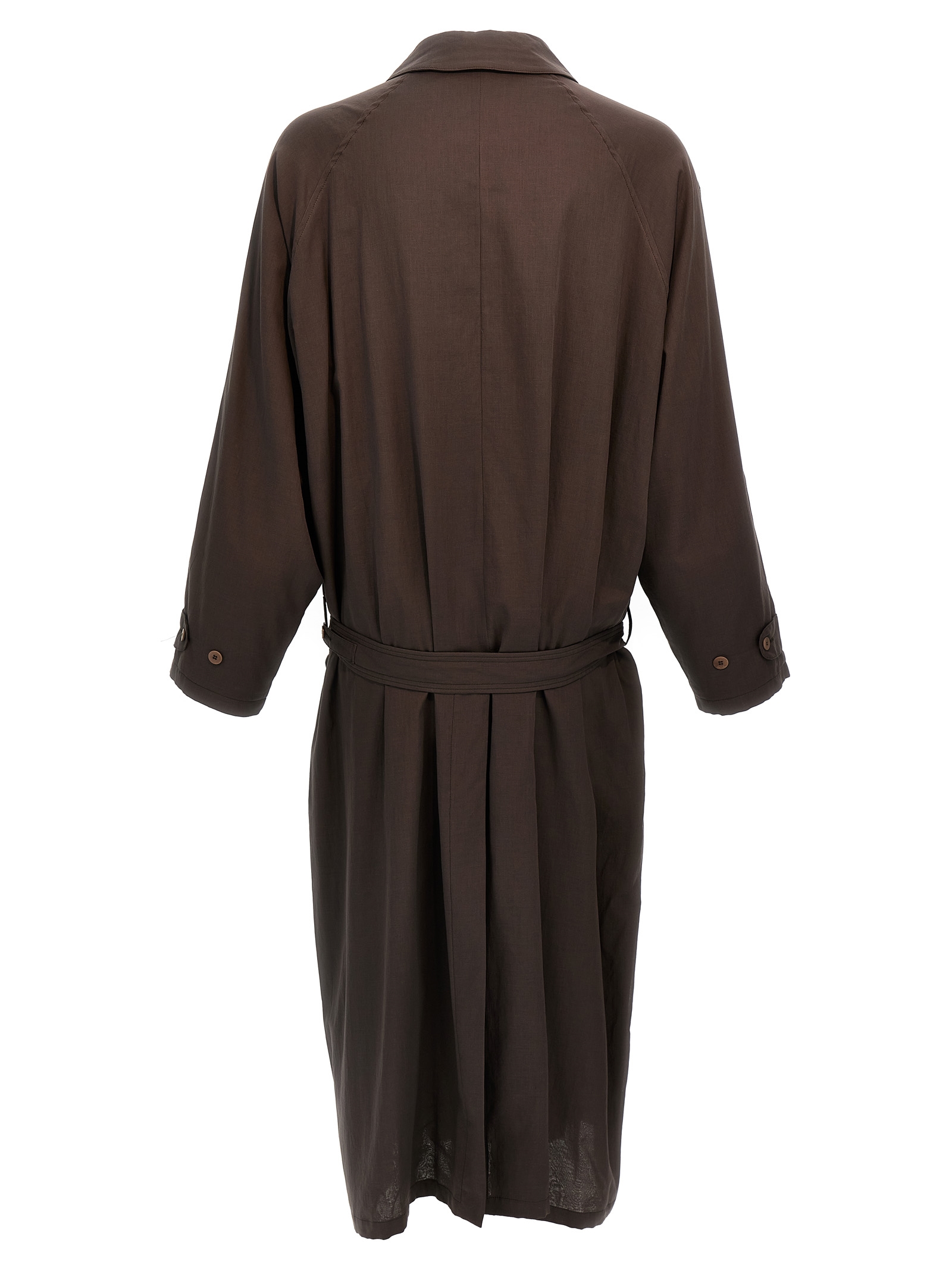 ‘La Sapienza’ light cotton coat with antique finish, under the throat, button closure, pockets, adjustable and removable belt, back vent.
