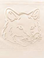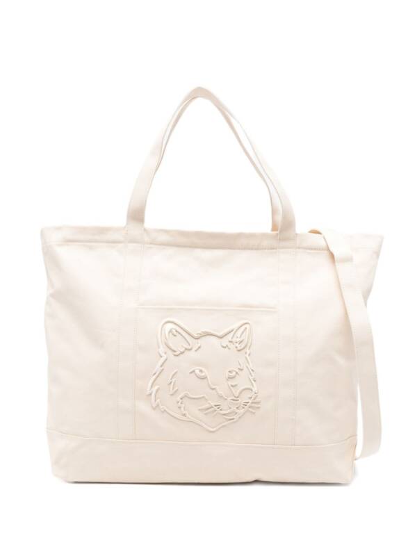 beige two top flat handles logo embroidery internal slip pocket Fox Head XL canvas tote.