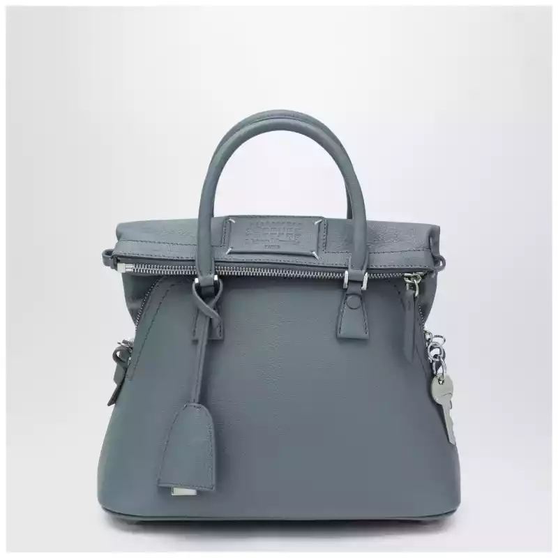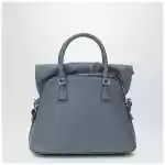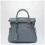 Mini bag by Maison Margiela in blue grey leather Two structured top handles Adjustable and removable shoulder strap Zip closure Numeric Signature label on the front Base with metal feet Keyring with padlock and key Four Stitches on the back. Size and Fit – Width 24 cm x Height 25 cm x Depth 3 cm Adjustable shoulder strap length min 32 cm – max 58 cm