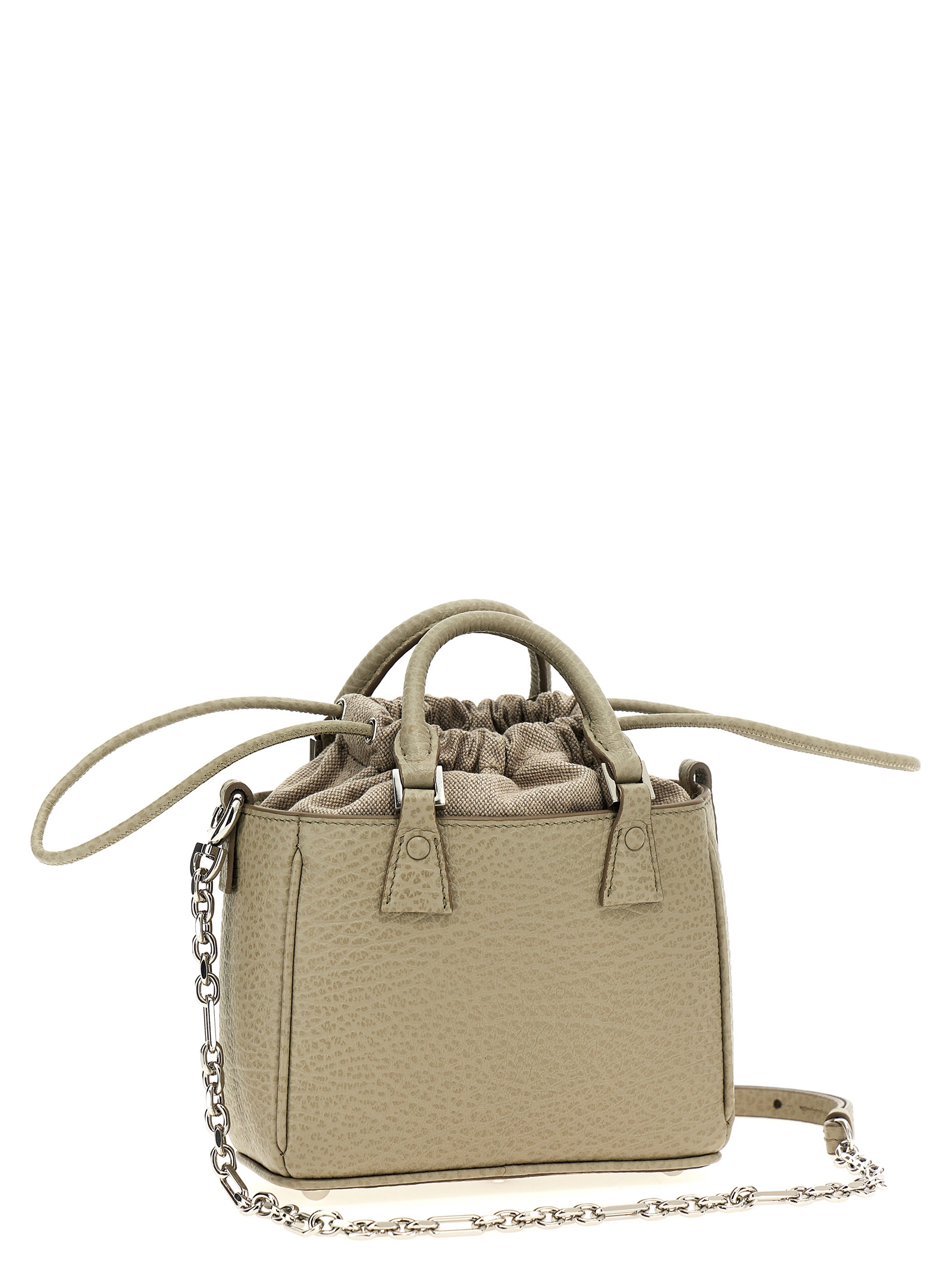 ‘5AC tote horizontal’ handbag in grainy leather, double fixed handle, drawstring closure, chain shoulder strap and removable leather.