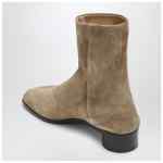 Maison Margiela ankle boots in beige suede, featuring a tabi toe, hook closure, white stitching on the back, low heel, and leather sole.