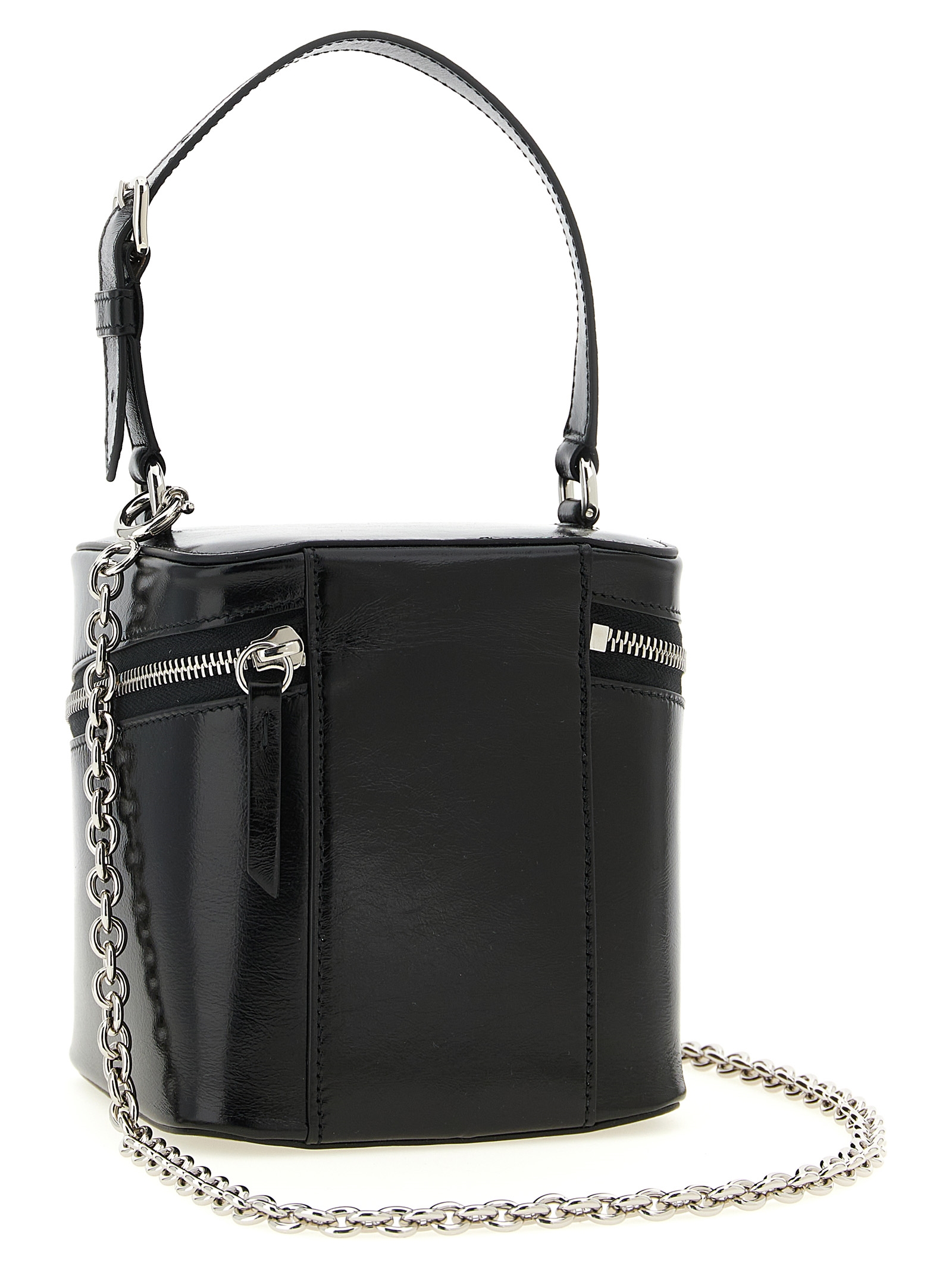 ‘Big Cube’ handbag in shiny leather, cubic shape with rigid bases, front ‘Four Stitches’, adjustable handle, zip closure, removable chain shoulder strap.