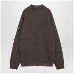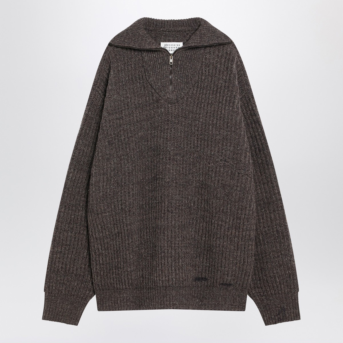 Maison Margiela”s brown ribbed wool blend sweater, featuring a zip collar, raglan sleeves, ribbed cuffs and hem, and an oversized fit.