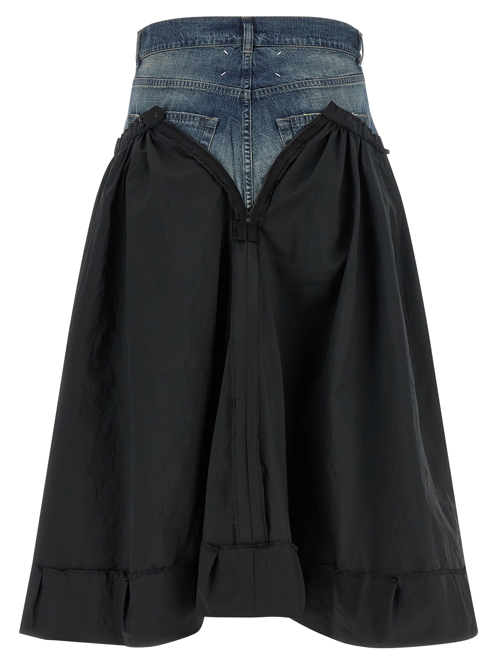 Midi skirt in wrinkled satin-effect fabric, Inside-out reverse construction, Flared silhouette, Trompe l’oeil jeans insert at the waist in cotton denim, Hook and front zip button closure, Five pockets, ‘four stitches’ at the back, Turn-up with raw cut hem on the hem.