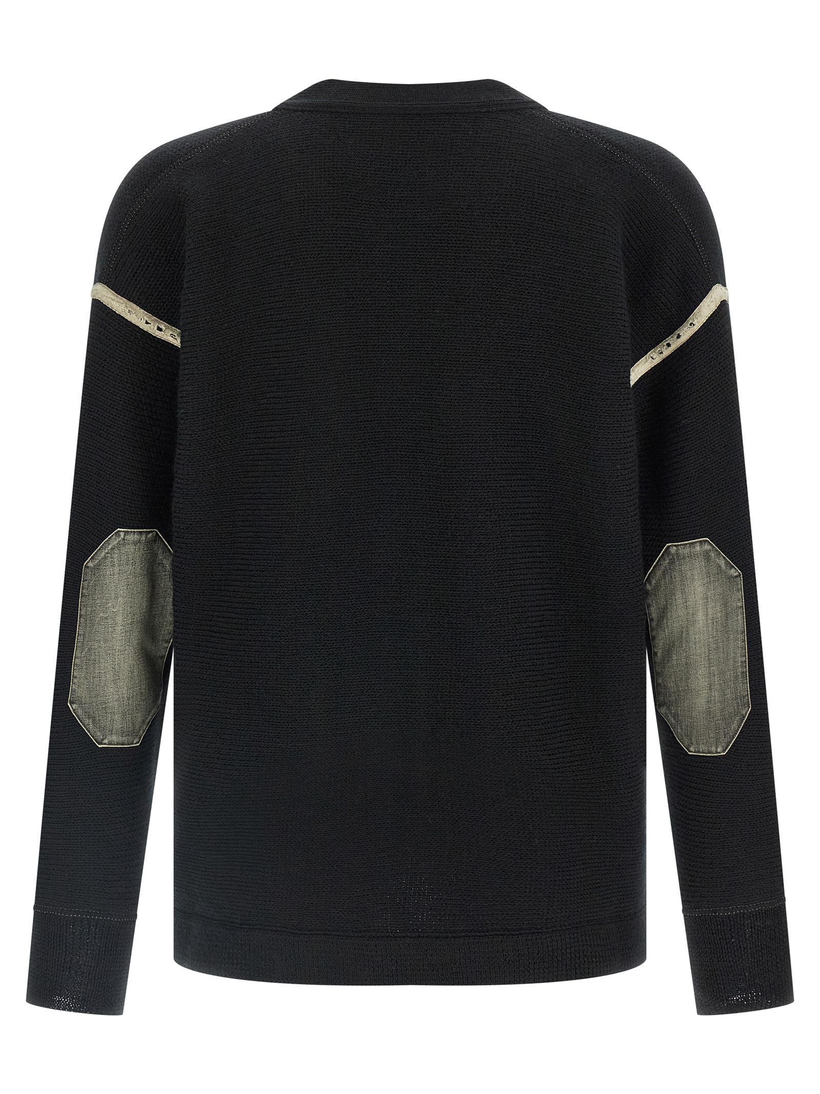 Virgin wool cardigan with v-neck, Front button closure, Long cuffed sleeves, Dropped shoulder, Contrasting used-effect cotton detail, And stonewashed cotton denim elbow patch.
