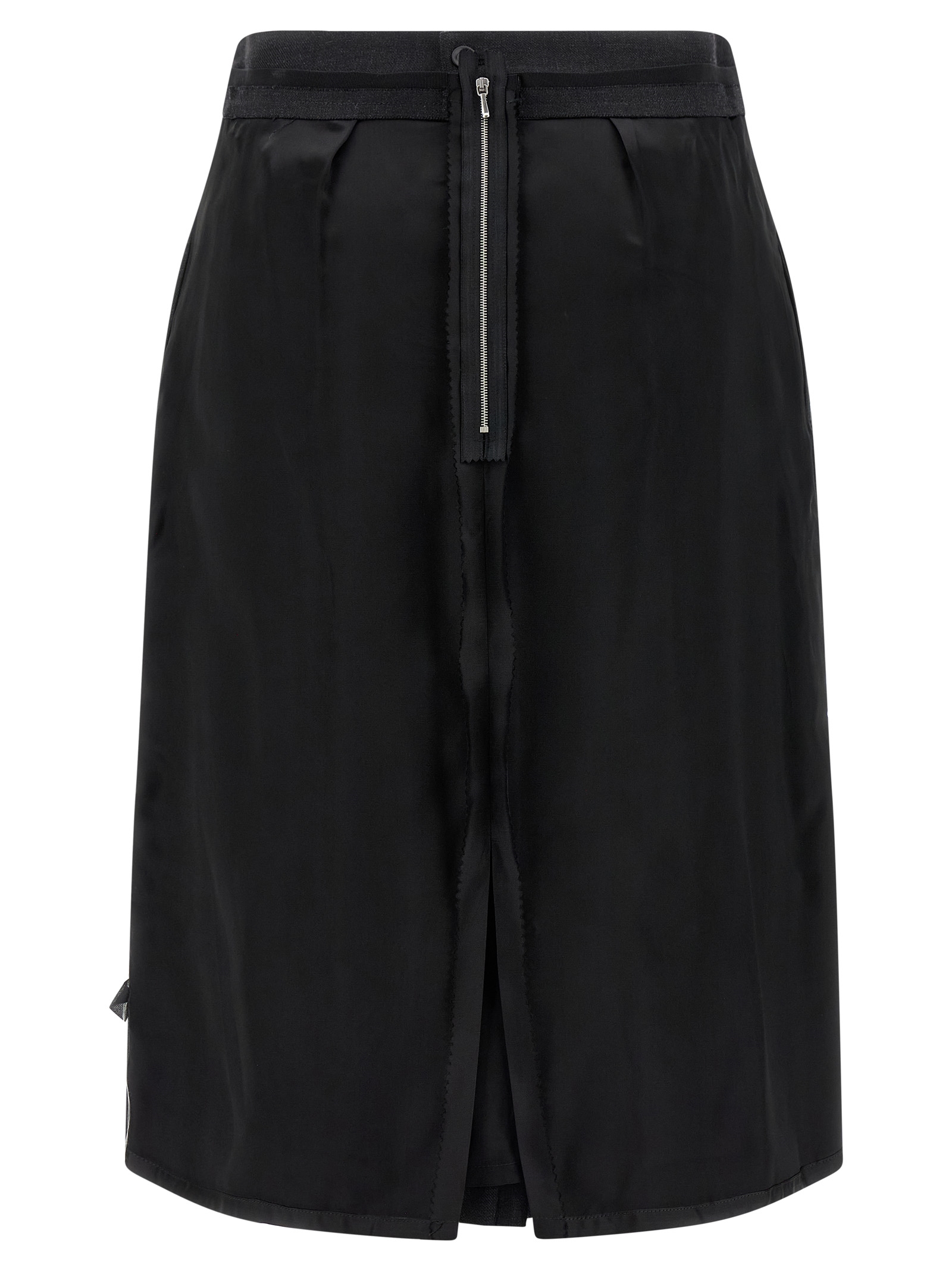 Wool midi skirt with satin back panel, inside-up construction with ‘Work-in-Progress’, ‘Four stitches’ stitching – zip and button closure – back split.
