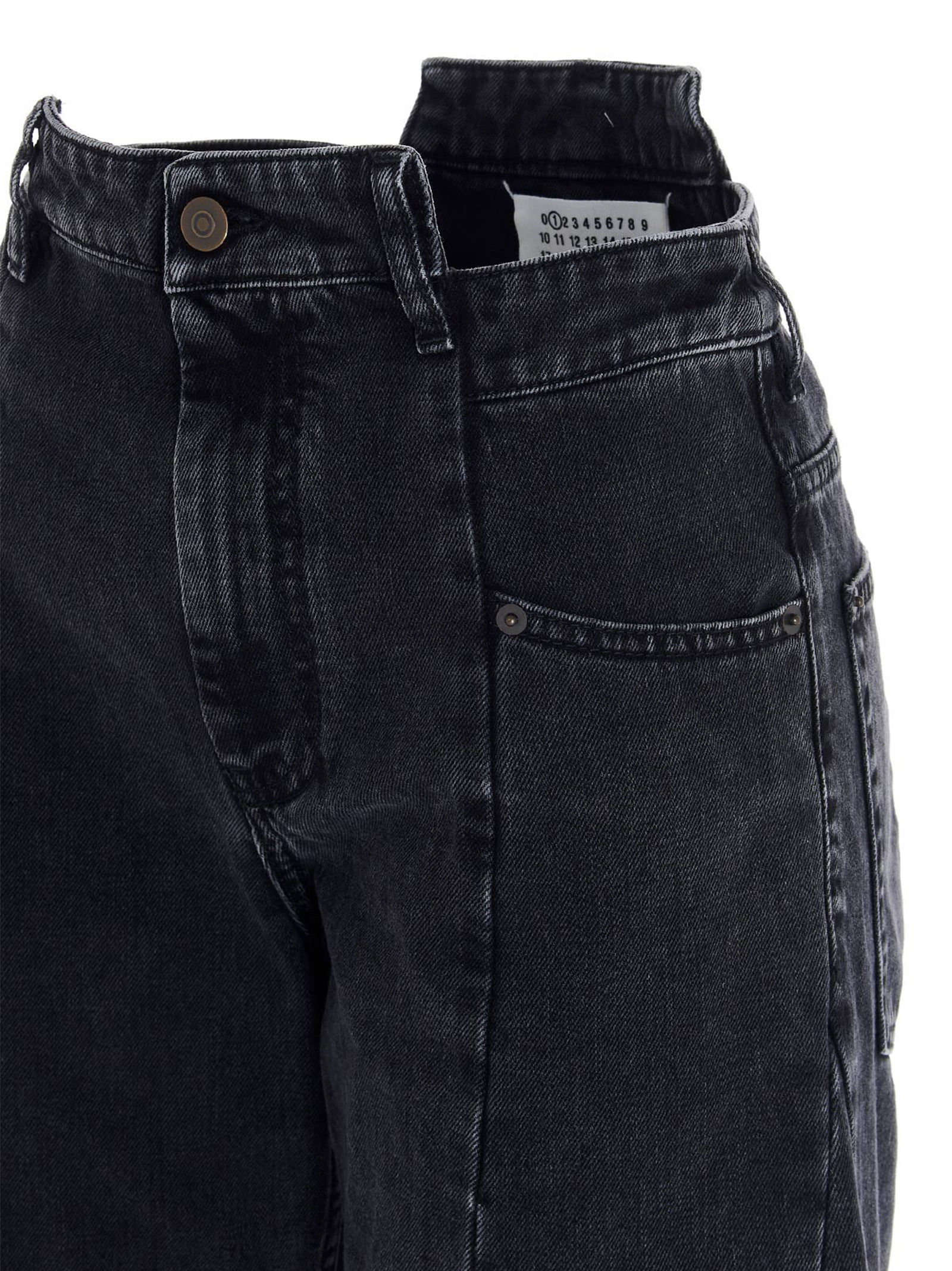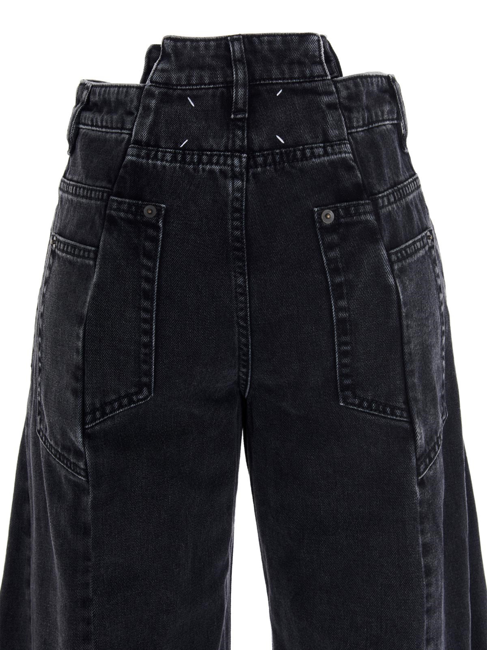 Cotton denim jeans with asymmetric waist and seams, Front and back darts, Wide leg, Zipper and button closure, Pockets.