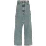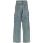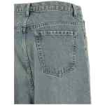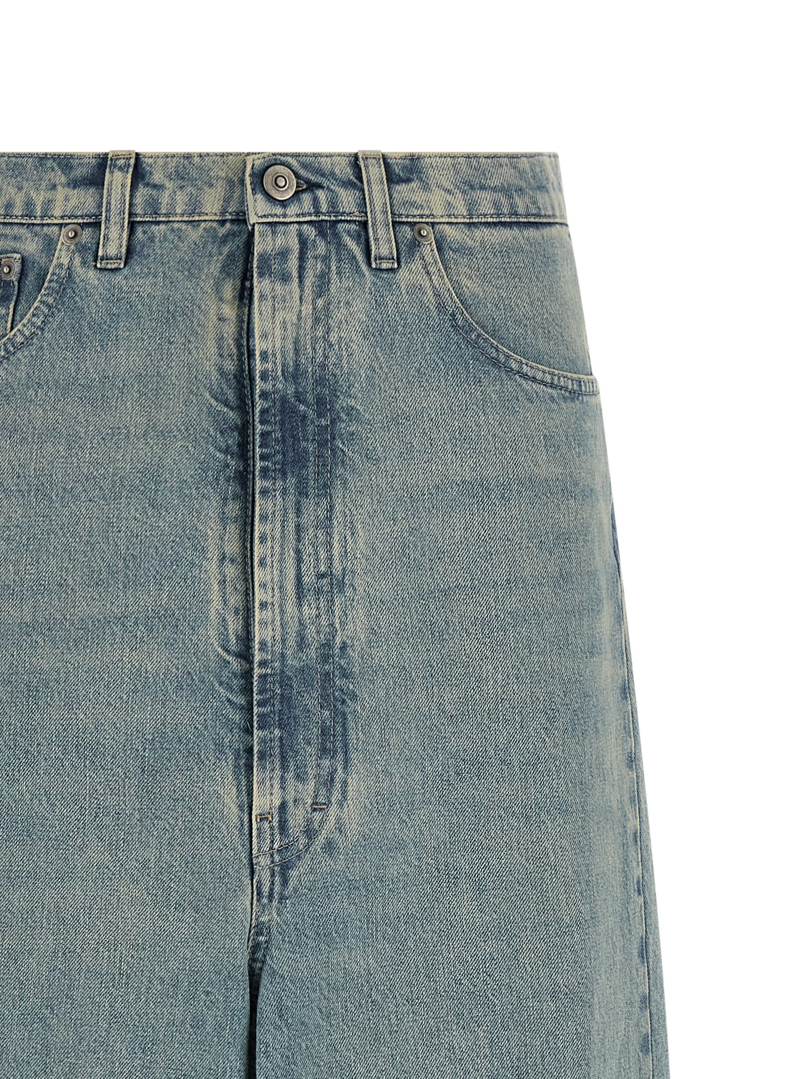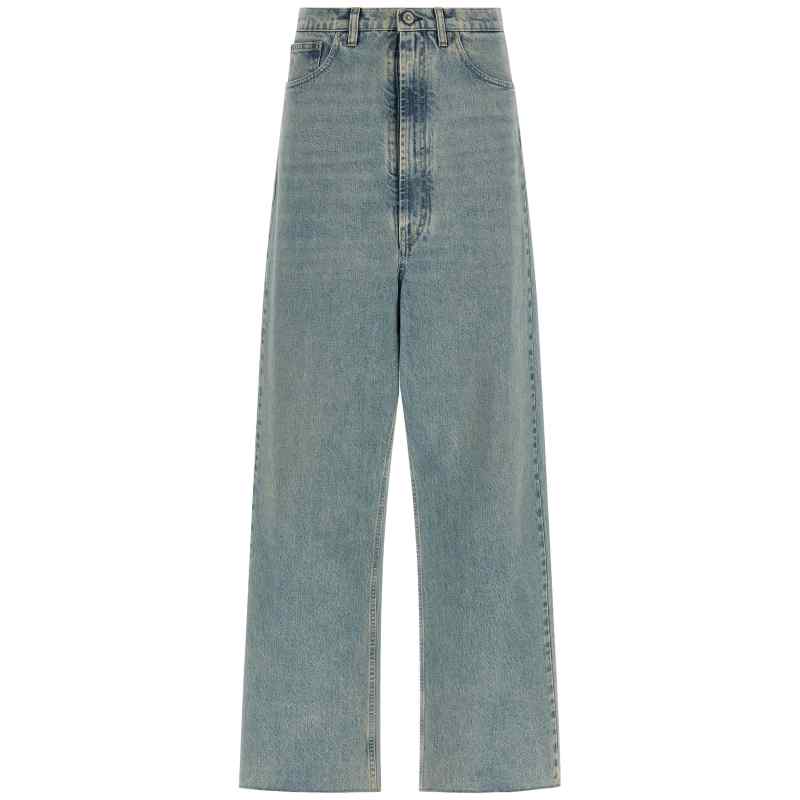Stone-washed cotton denim jeans, Low crotch, Wide and straight leg, Front zip and button closure, Five pockets, ‘four stitches’ at the back, Leg bottoms with raw cut hem. Size and Fit – True to size fit
