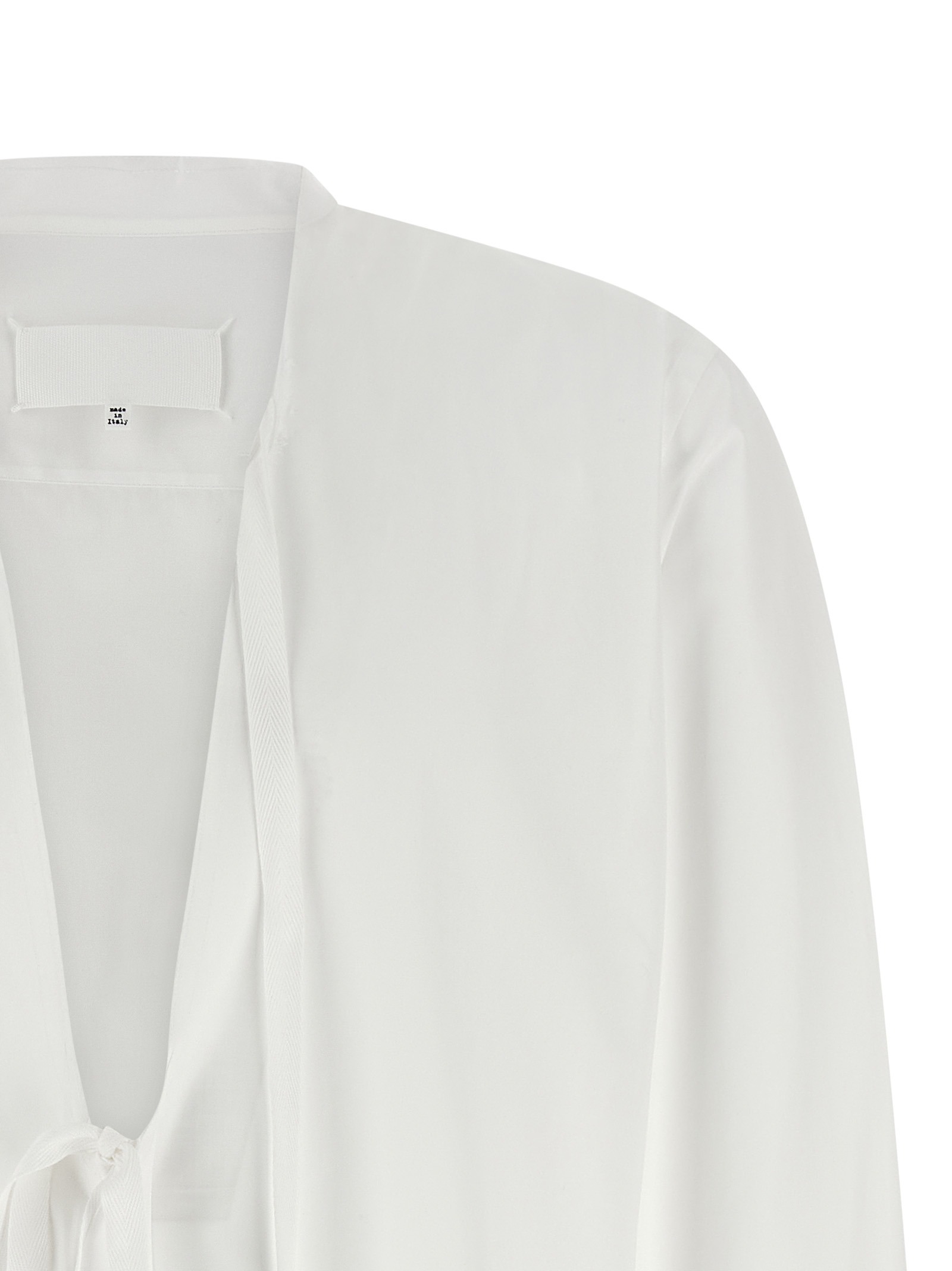 Cotton poplin shirt, V-neck with raw cut hem and tone-on-tone grosgrain ribbons to tie as desired, Front mother-of-pearl button closure, Long sleeves with wide cuffs, ‘four stitches’ at the back, Rounded and asymmetrical hem.
