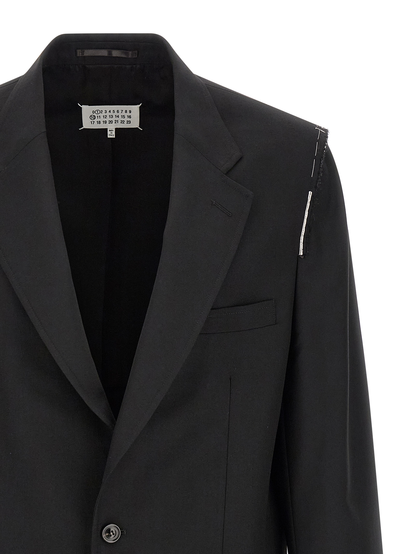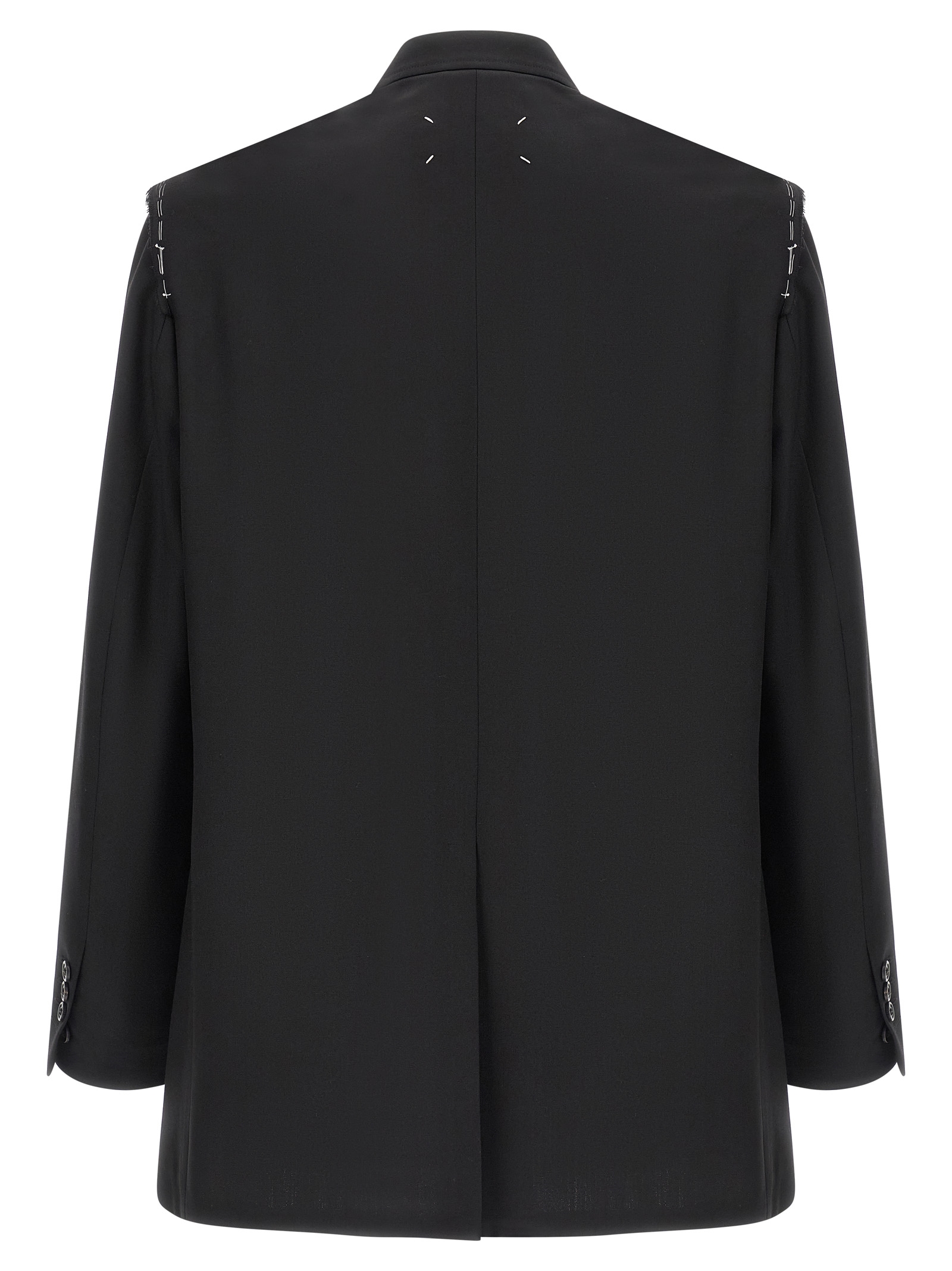 Single-breasted wool blazer, structured line interrupted on the shoulders, raw-cut elements, traditional mirror lapels, front button closure, ‘Four stiches’ logo detail at the back, long sleeves with opening buttons.