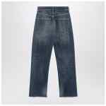 Maison Margiela jeans in faded blue cotton denim, featuring front zip and button closure, belt loops, five classic pockets, raw-cut hem, distressed details, contrasting stitching, straight leg, and signature Four Stitches logo on the back.