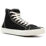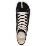 Tabi split-toe high-top sneakers from Maison Margiela featuring black, cotton, branded leather insole, split toe, front lace-up fastening, ankle-length and flat rubber sole. Tabi canvas sneakers