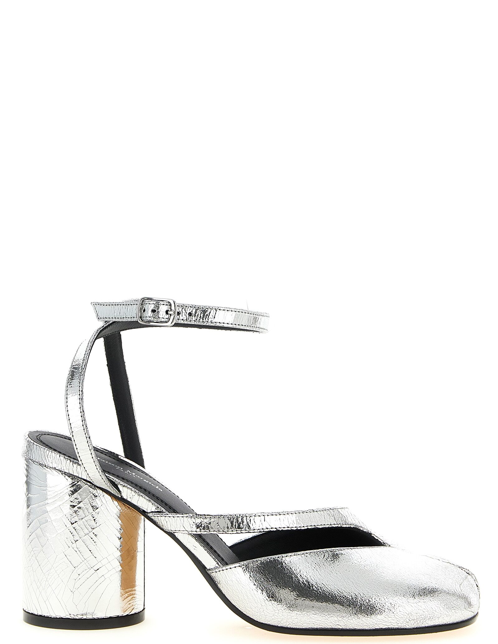Calf leather sandals with ‘Broken Mirror’ finish, iconic ‘Tabi’ split toe, front cut-out, adjustable ankle strap with back signature stitching, cylindrical heel, leather and rubber sole.