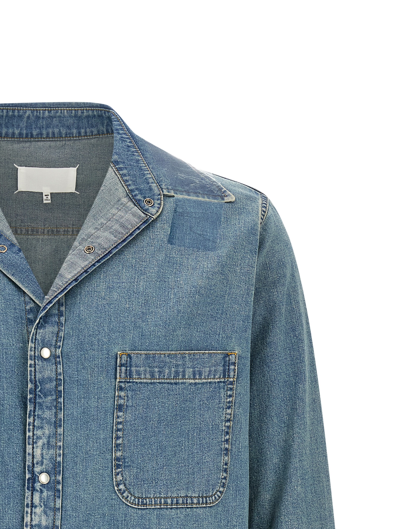 ‘taped’ stone washed cotton denim shirt with upper back, Collar and cuffs covered with transparent tape, Breast pocket, Front snap button closure, Long sleeves with cuffs, ‘four stitches’ at the back, Side slits on a rounded hem. Size and Fit – true to size fit