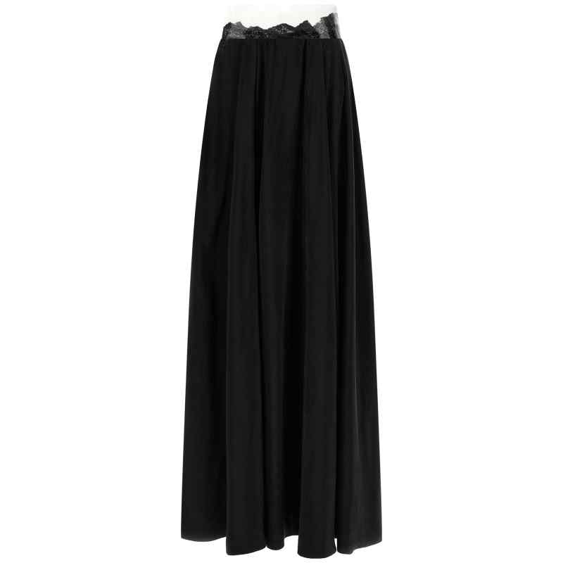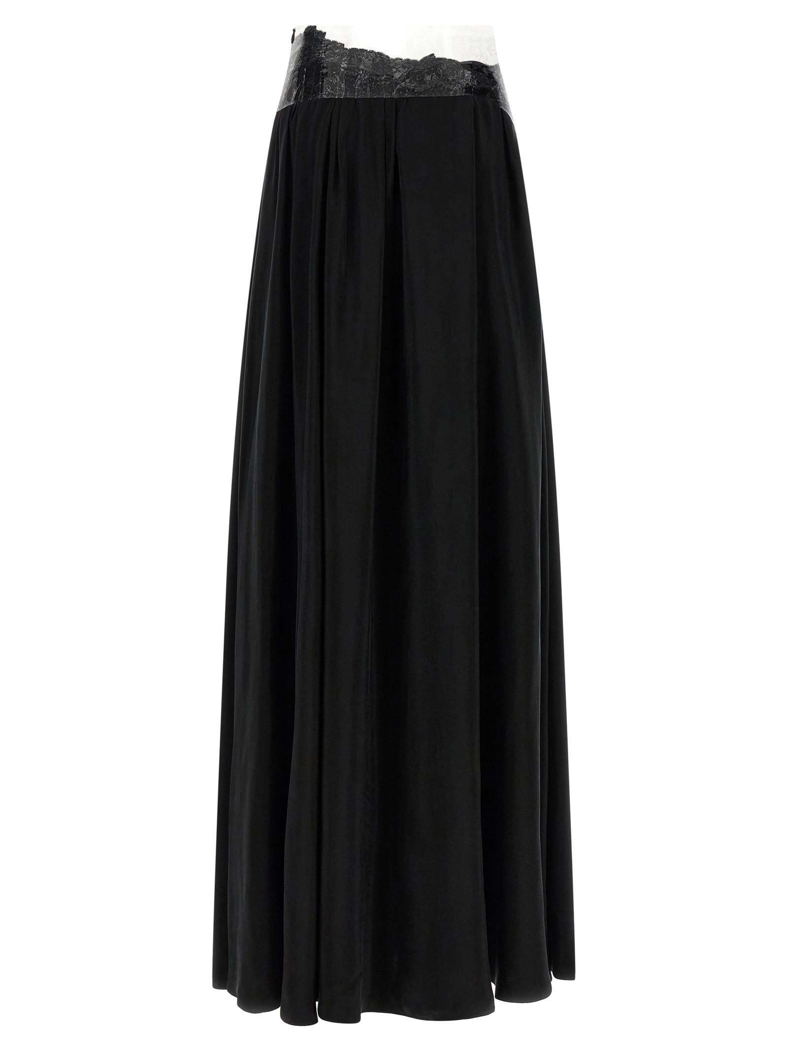 Long ‘taped’ flowing cupro skirt with flared silhouette, Transparent ribbon waist with lace trim underneath, Side zip closure, Back ‘four stitches’. Size and Fit – True to size fit