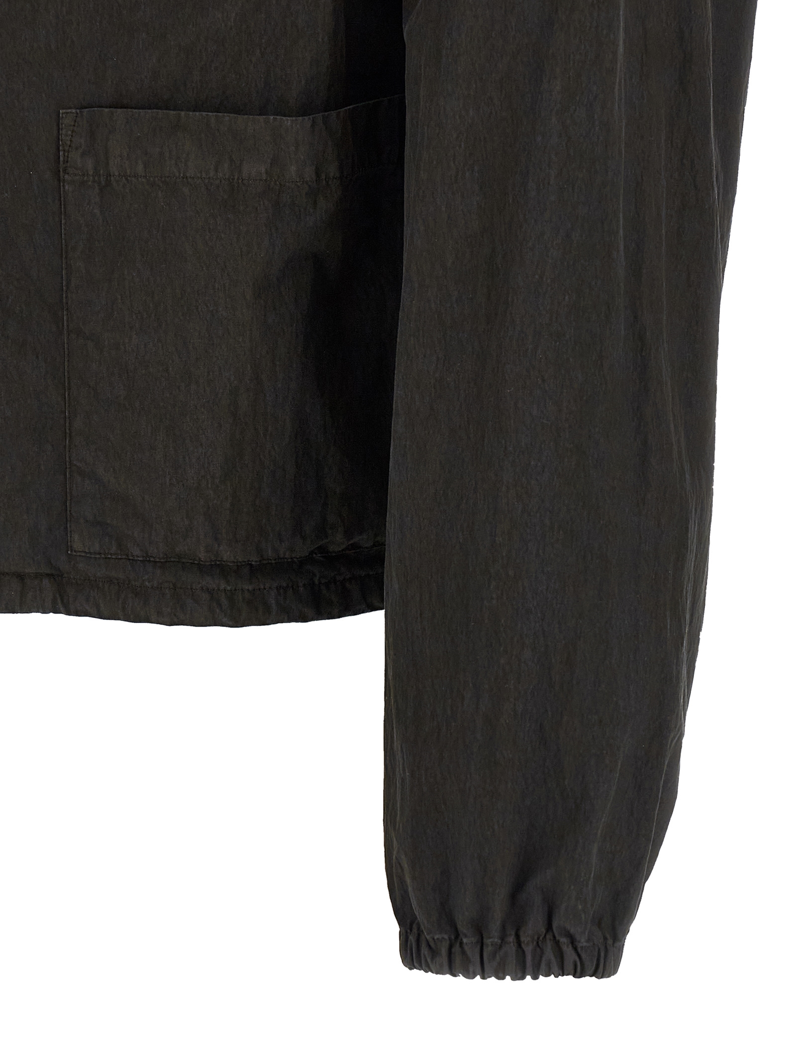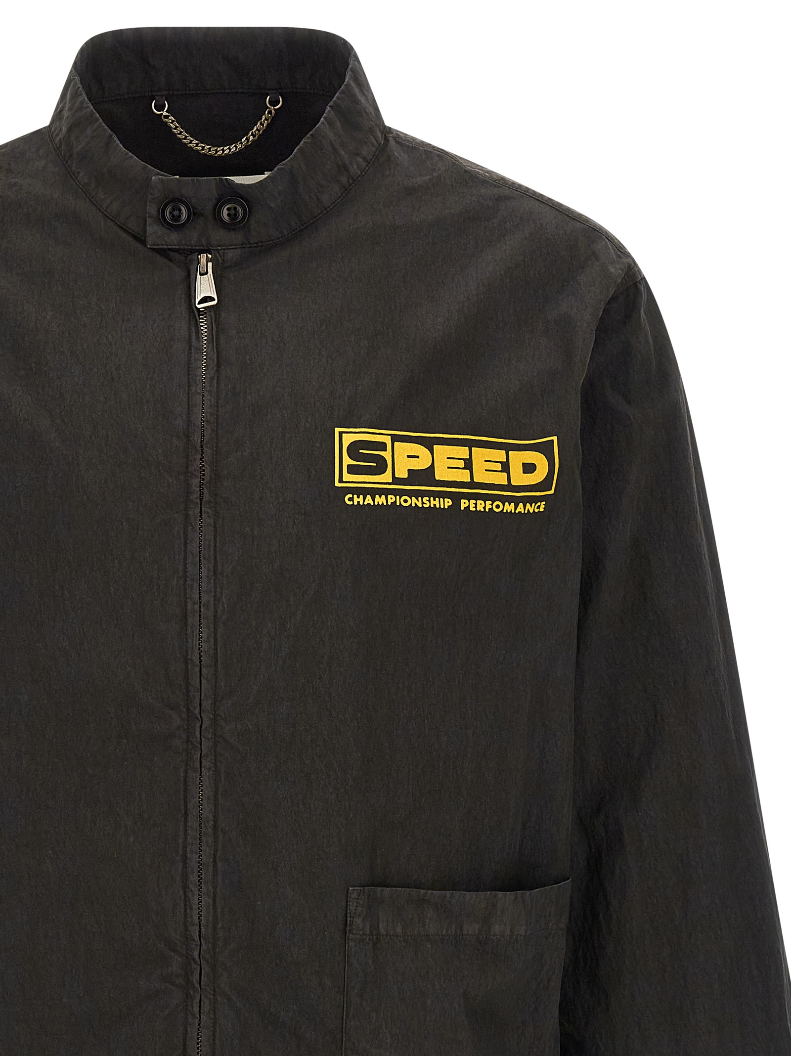 Vintage style sports jacket in washed cotton, high collar with buckle detail, drawstring hem, front zip closure with collegiate style graphic print, front patch pocket, long sleeves with elastic cuffs.