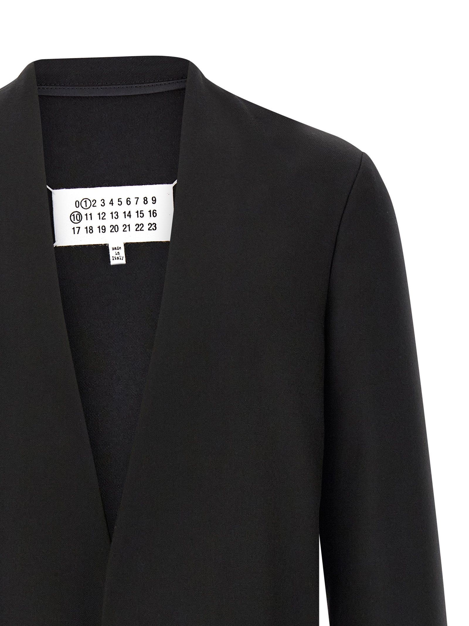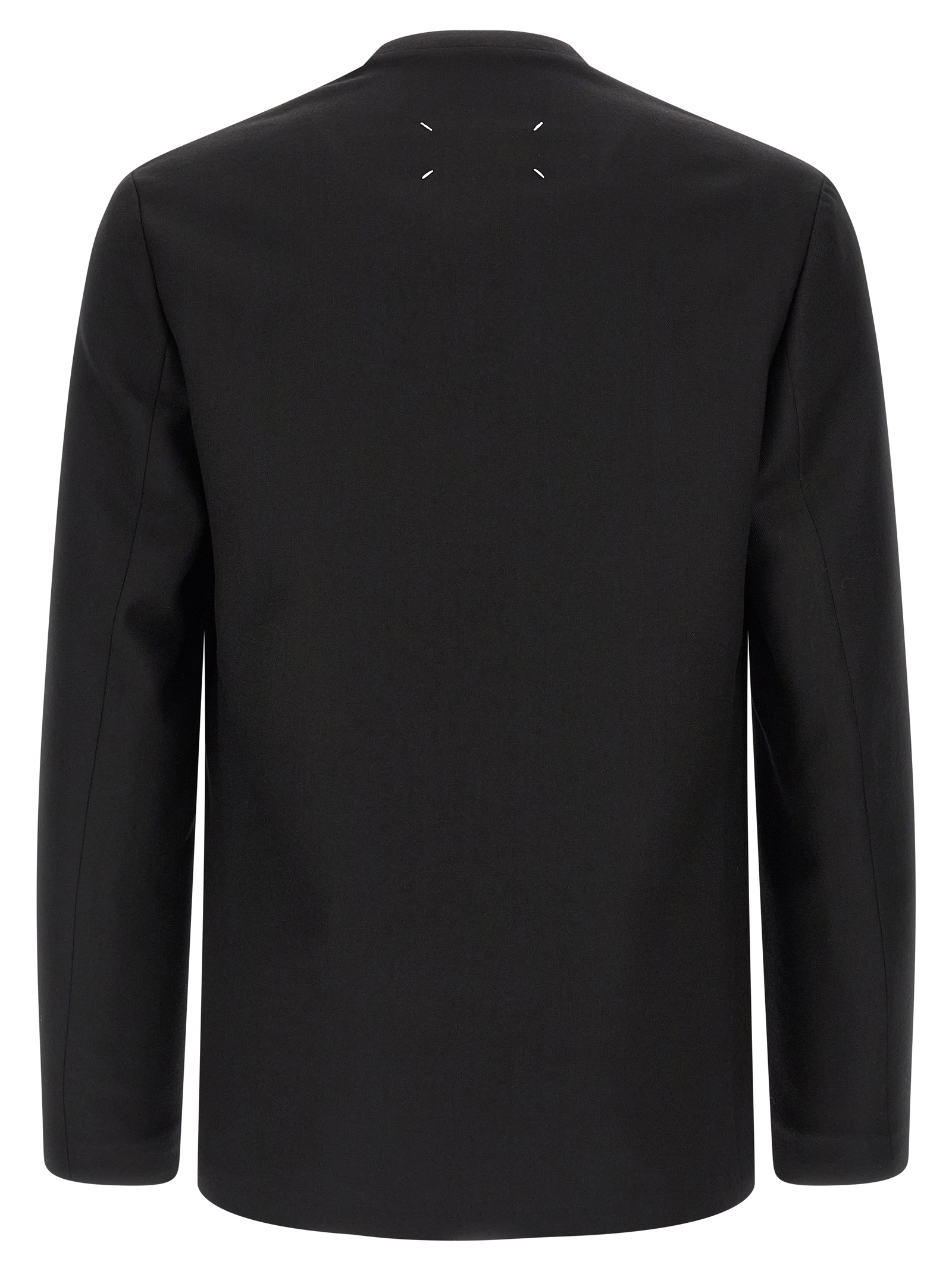 Wool blazer jacket, unlined, V-neck with curved lines, no closures, long sleeves, back ‘4 Stiches’ logo detail
