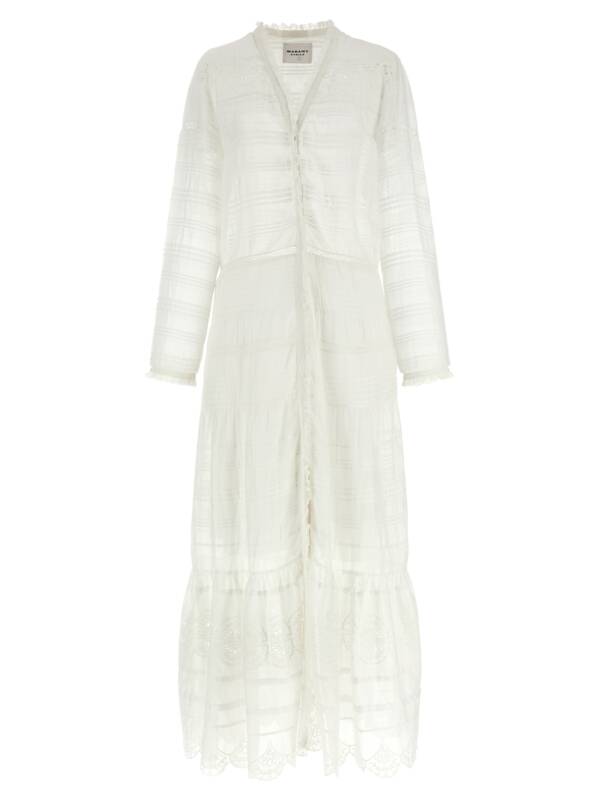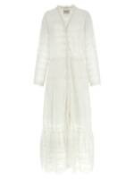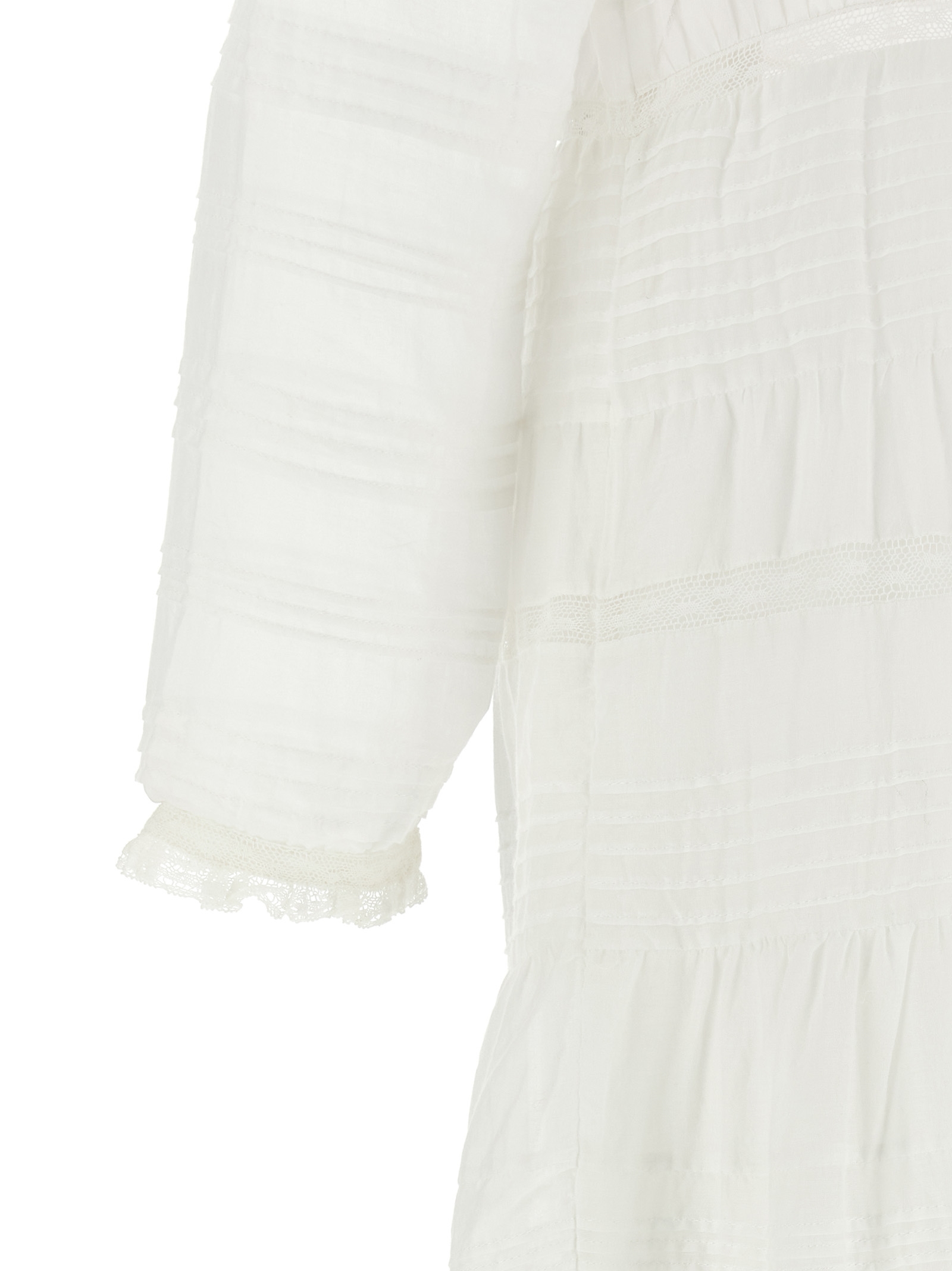 Long ‘daniva’ dress in light cotton with lace inserts at the crochet i see i do not see and details in sangallo, V-neck, Front hidden button closure, Long sleeves with cuffs, Flounce on asymmetrical hem, Lining. Size and Fit – True to size fit – french size