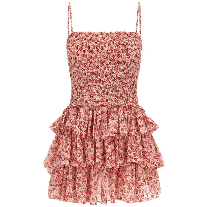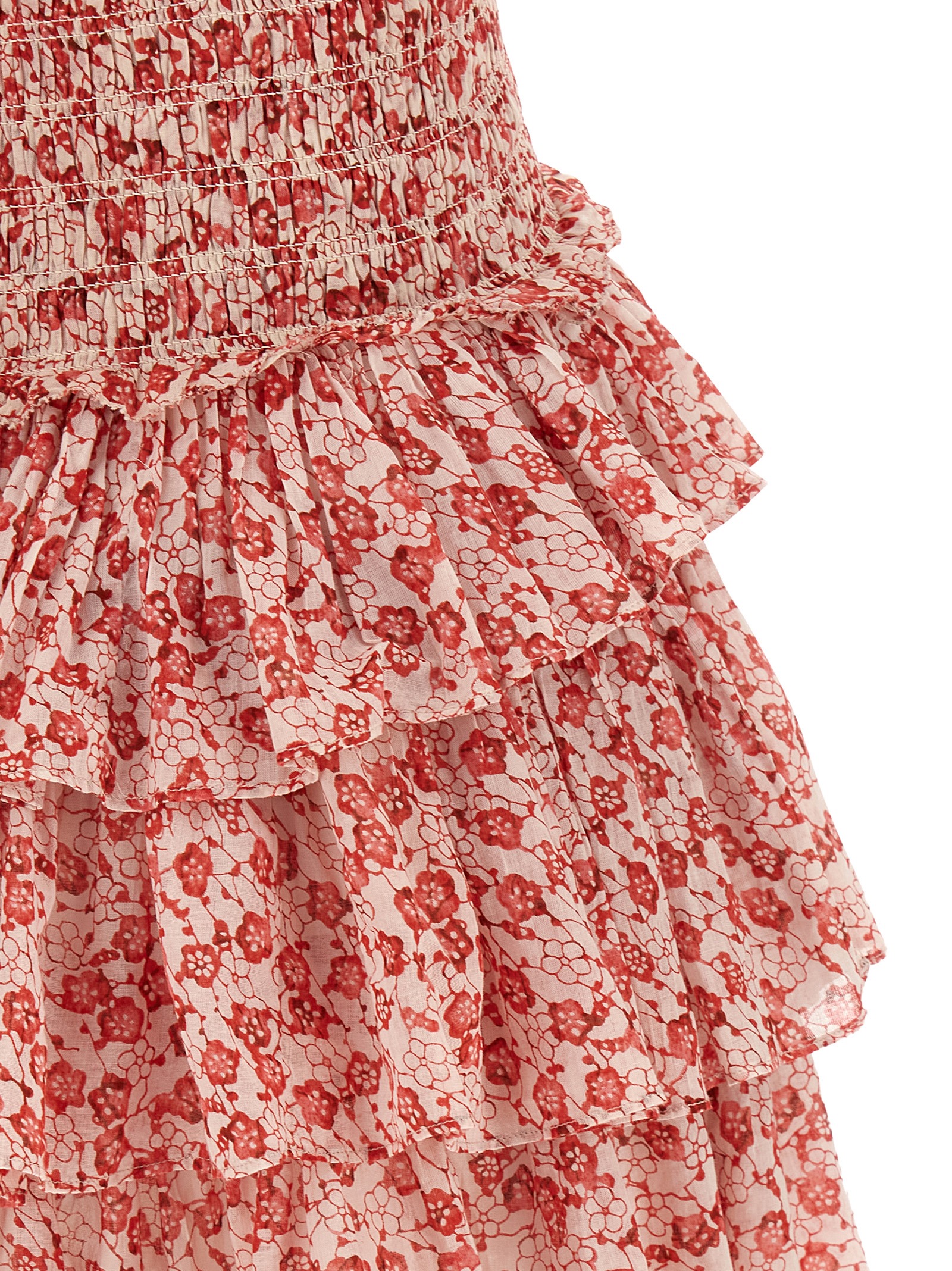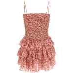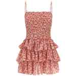‘elodie’ mini dress in cotton with all-over floral print, Smock stitch elastic, Thin adjustable straps, Ruffles with curls. Size and Fit – True to size fit