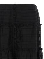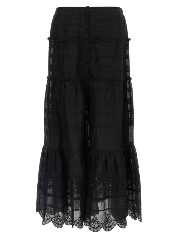 Long ‘paoline’ flared skirt with cotton ruffles with front button closure and central split, Floral lace inserts and broderie inserts. Size and Fit – True to size fit