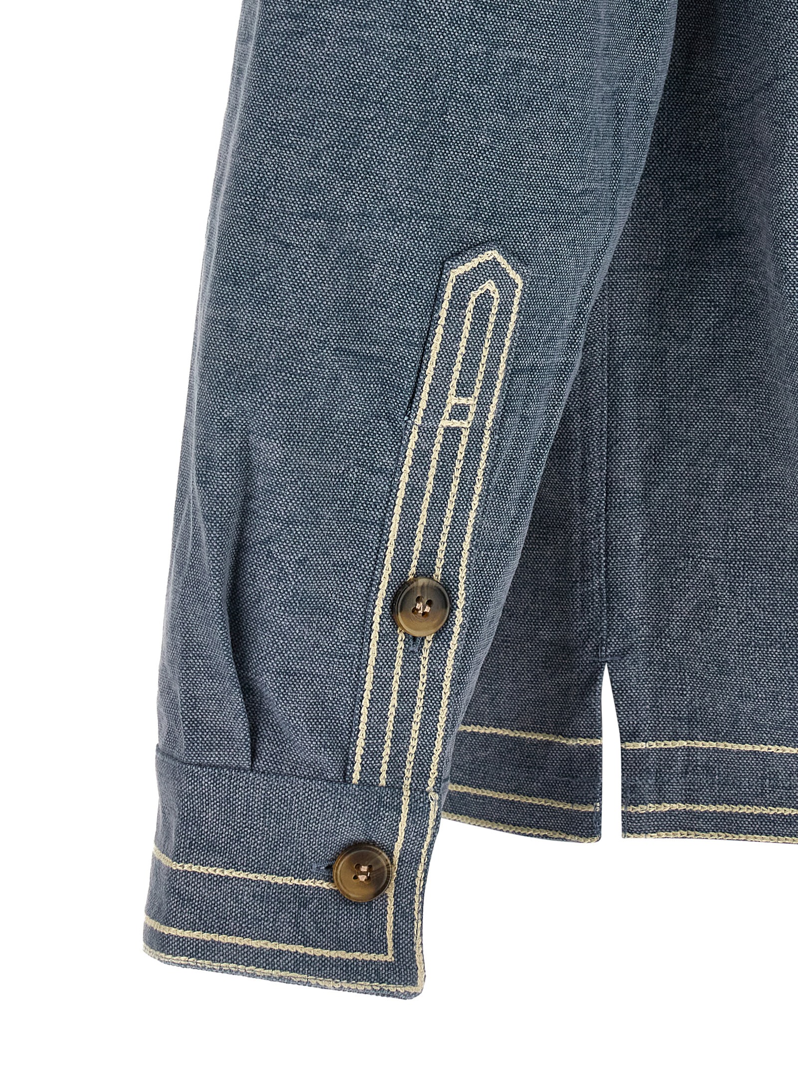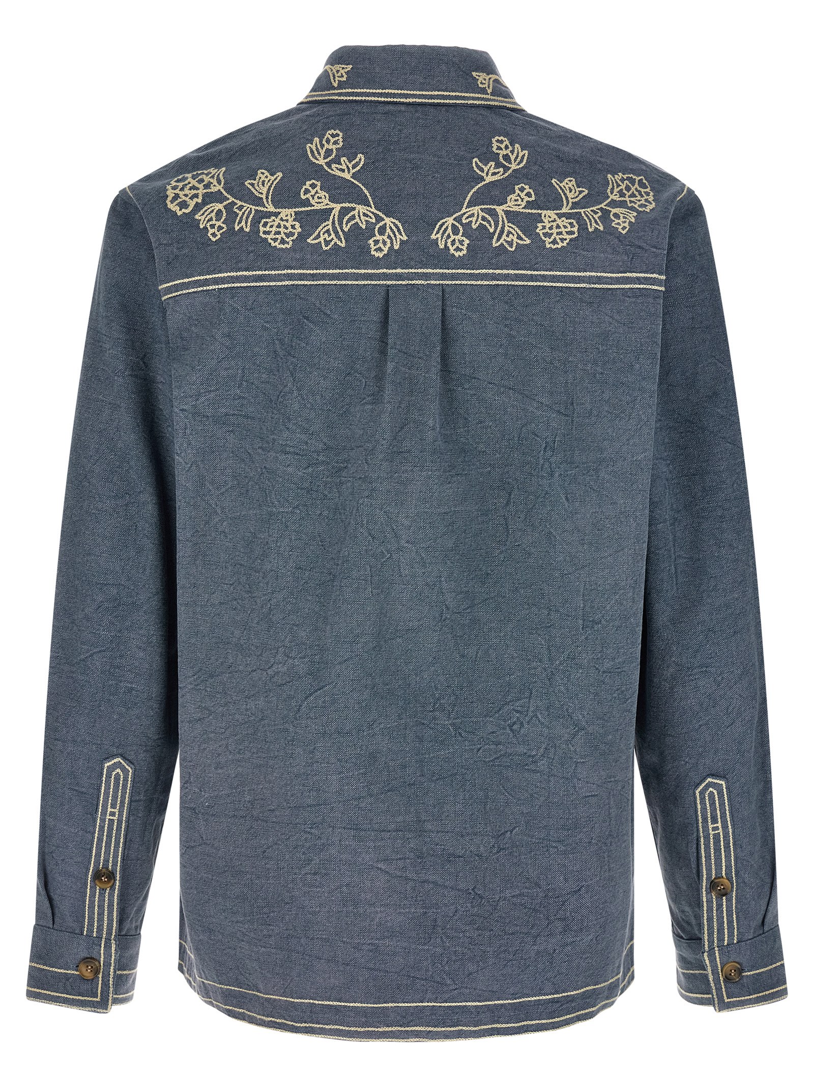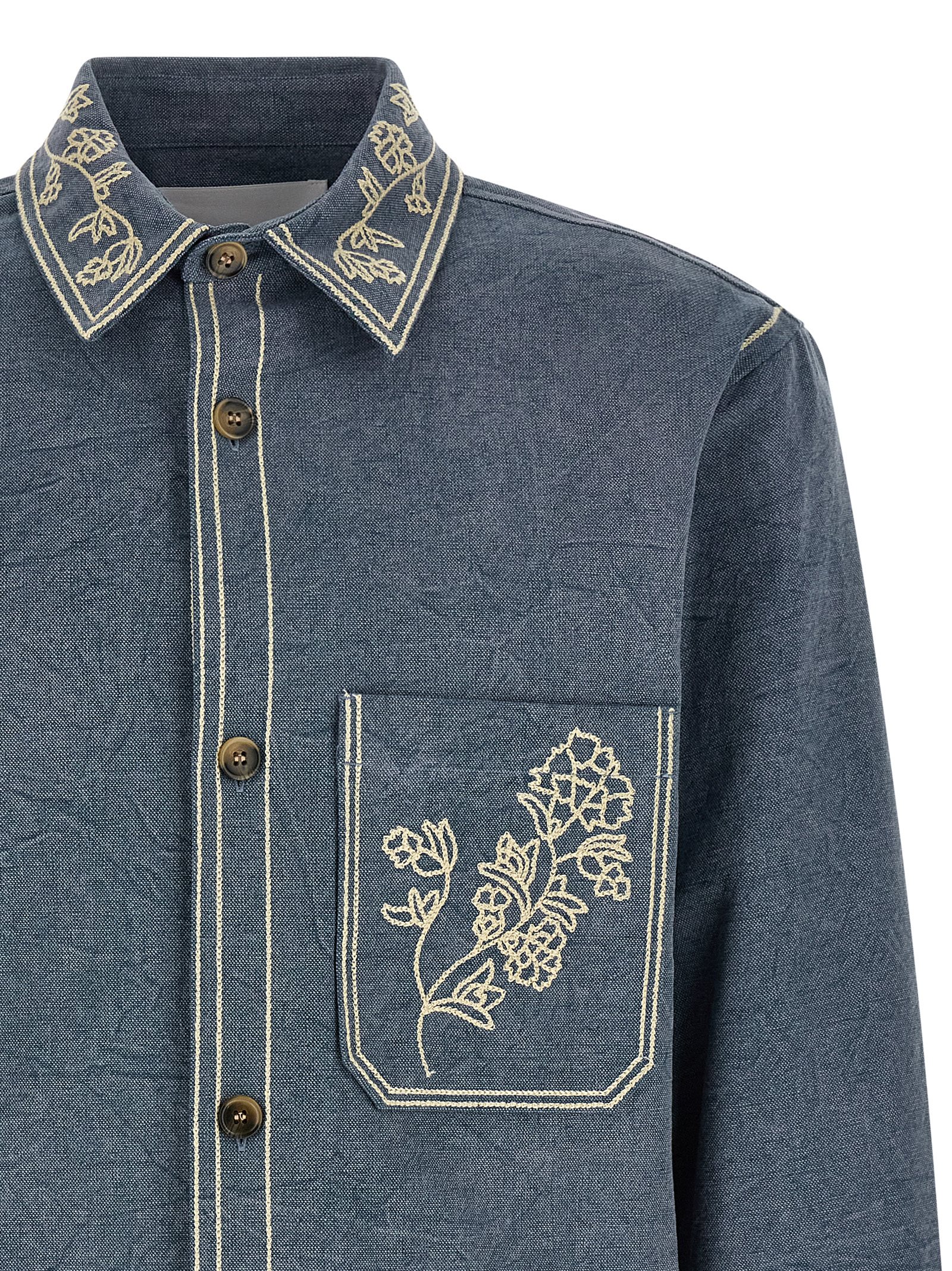 ‘rudy’ cotton overshirt with contrast floral embroidery, Classic collar, Front button closure, Patch pocket, Contrast stitching, Long cuffed sleeves. Size and Fit – True to size fit