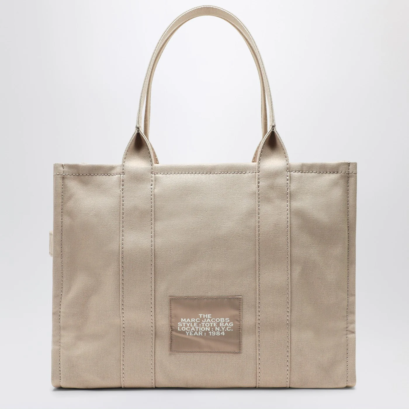 Large beige textured cotton canvas bag from Marc Jacobs featuring two top handles zip fastening two slit pockets and one zipped pocket on the inside contrasting front lettering and logo patch on the back.