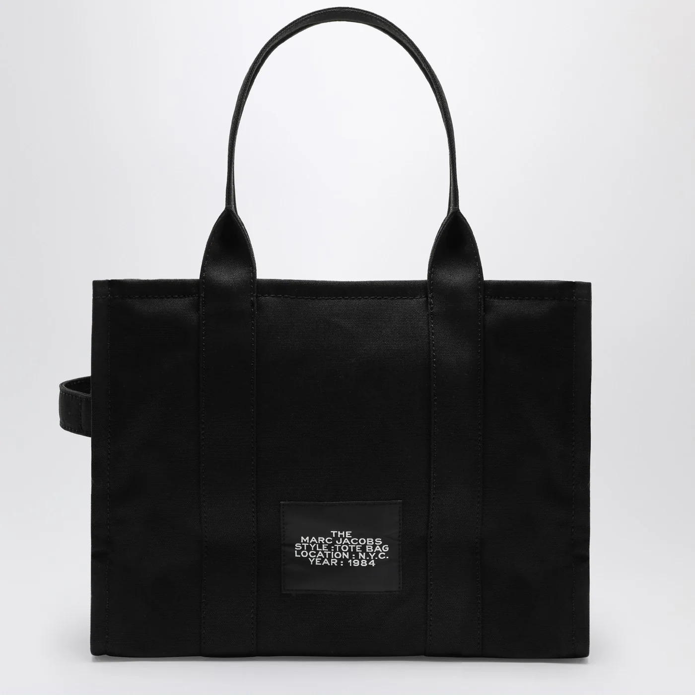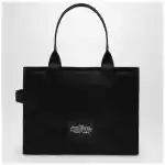 Large tote bag by Marc Jacobs in black textured cotton canvas featuring two top handles zip closure two slip pockets and one zip pocket inside contrasting front logo lettering and logo patch on the back.