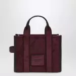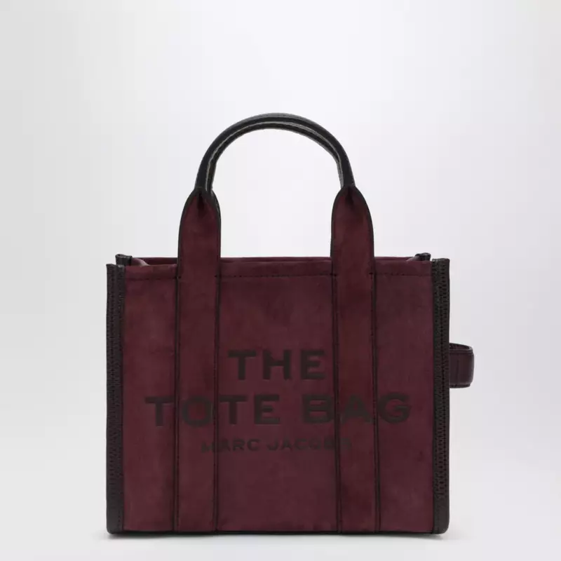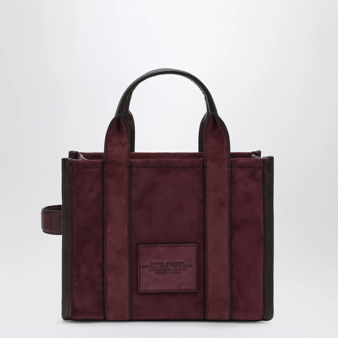 Small Tote bag by Marc Jacobs in suede and leather in plum color featuring a removable and adjustable shoulder strap two top handles zip closure two slip pockets inside front logo lettering and logo patch on the back.