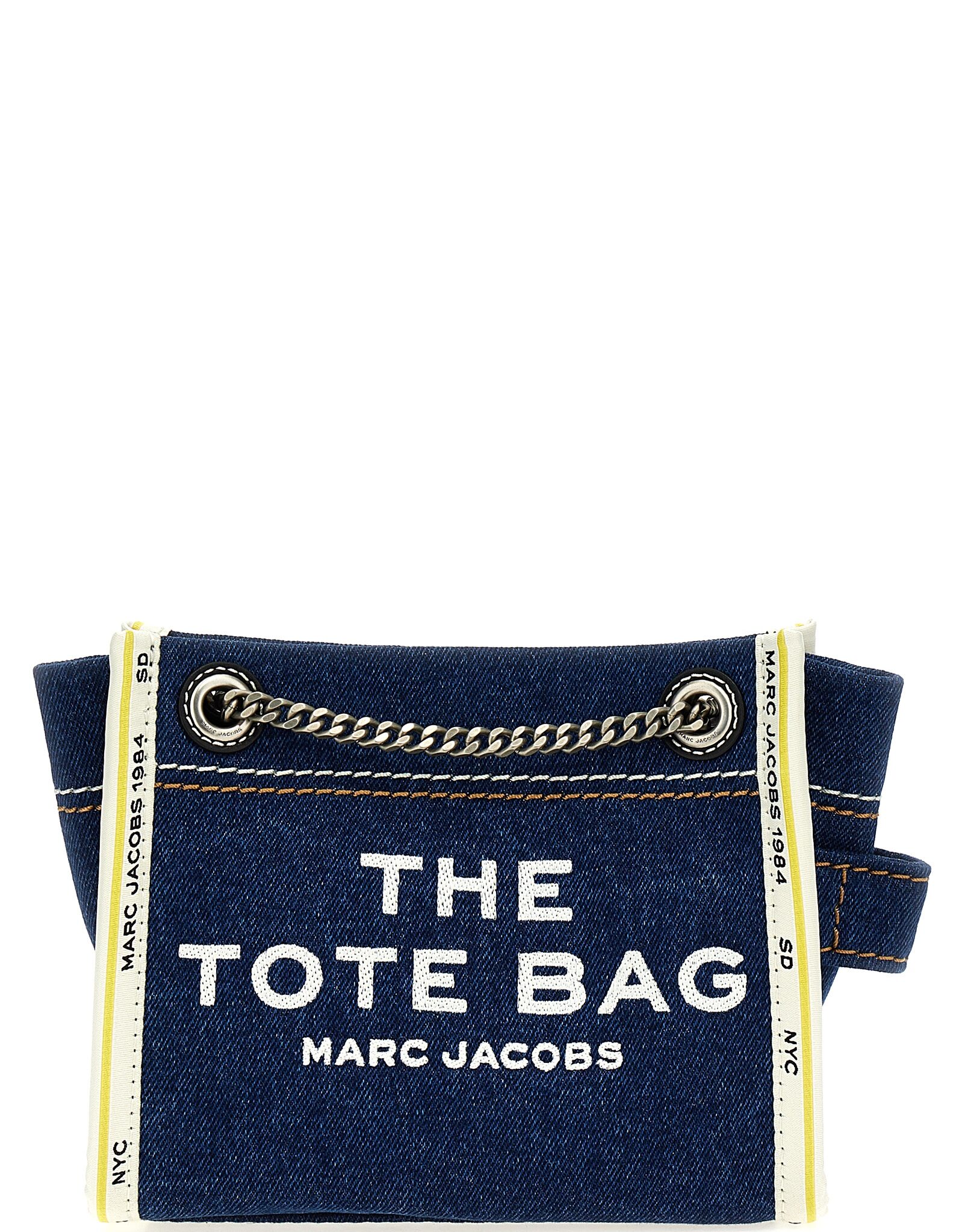 ‘The Denim Chain Crossbody Tote’ cotton denim crossbody bag with sliding chain, magnetic closure, front logo embroidery.