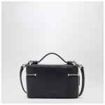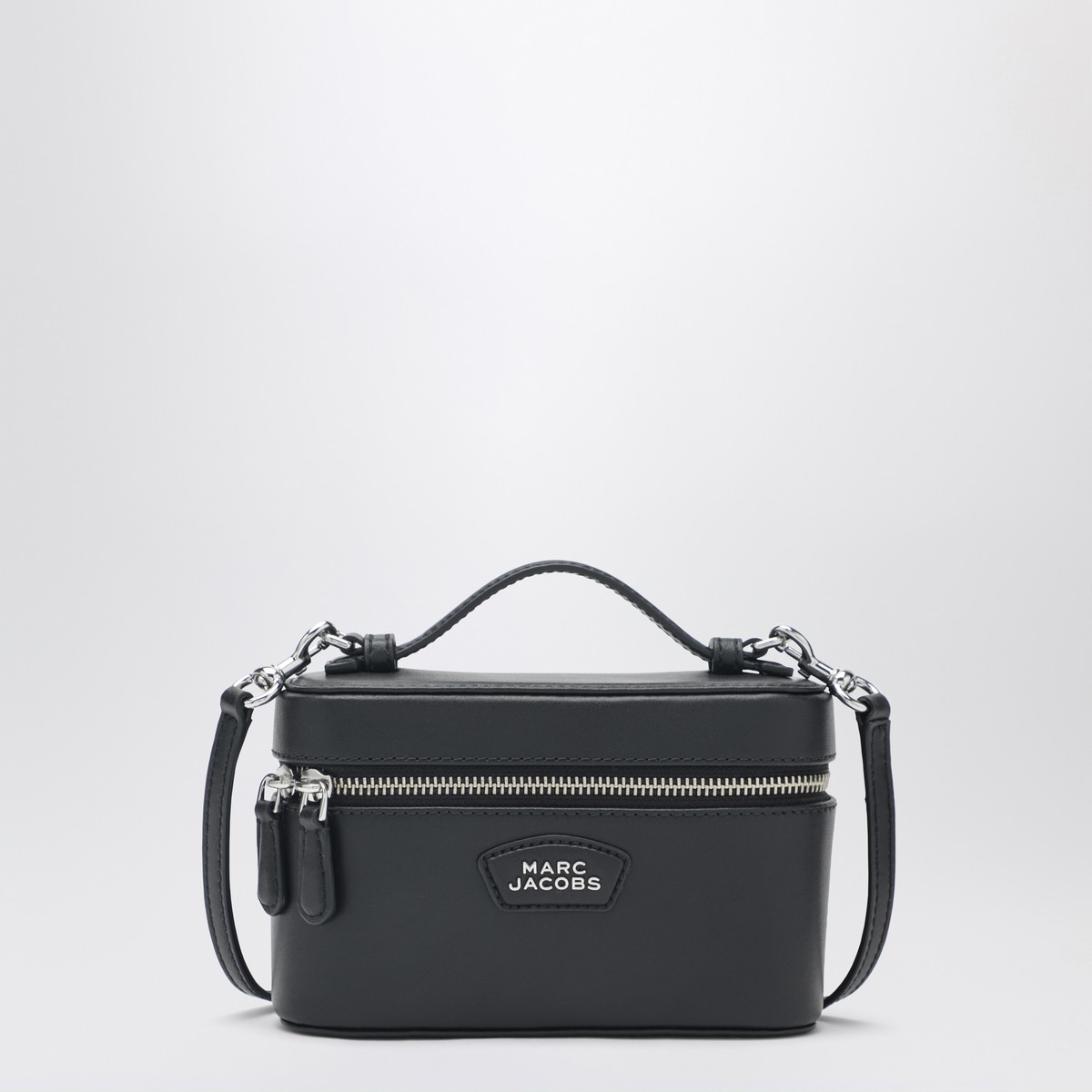 Vanity bag by Marc Jacobs in smooth black leather, featuring double zip closure, one top handle, removable and adjustable leather shoulder strap, silver-tone metal hardware and front metal logo lettering patch.