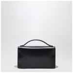 Marc Jacobs mini bag in black glossy leather, featuring a top handle, removable chain shoulder strap, daisy-shaped internal mirror, internal zip pocket, card compartment, flap closure with magnetic button, metal logo lettering on the front and silver-tone hardware.