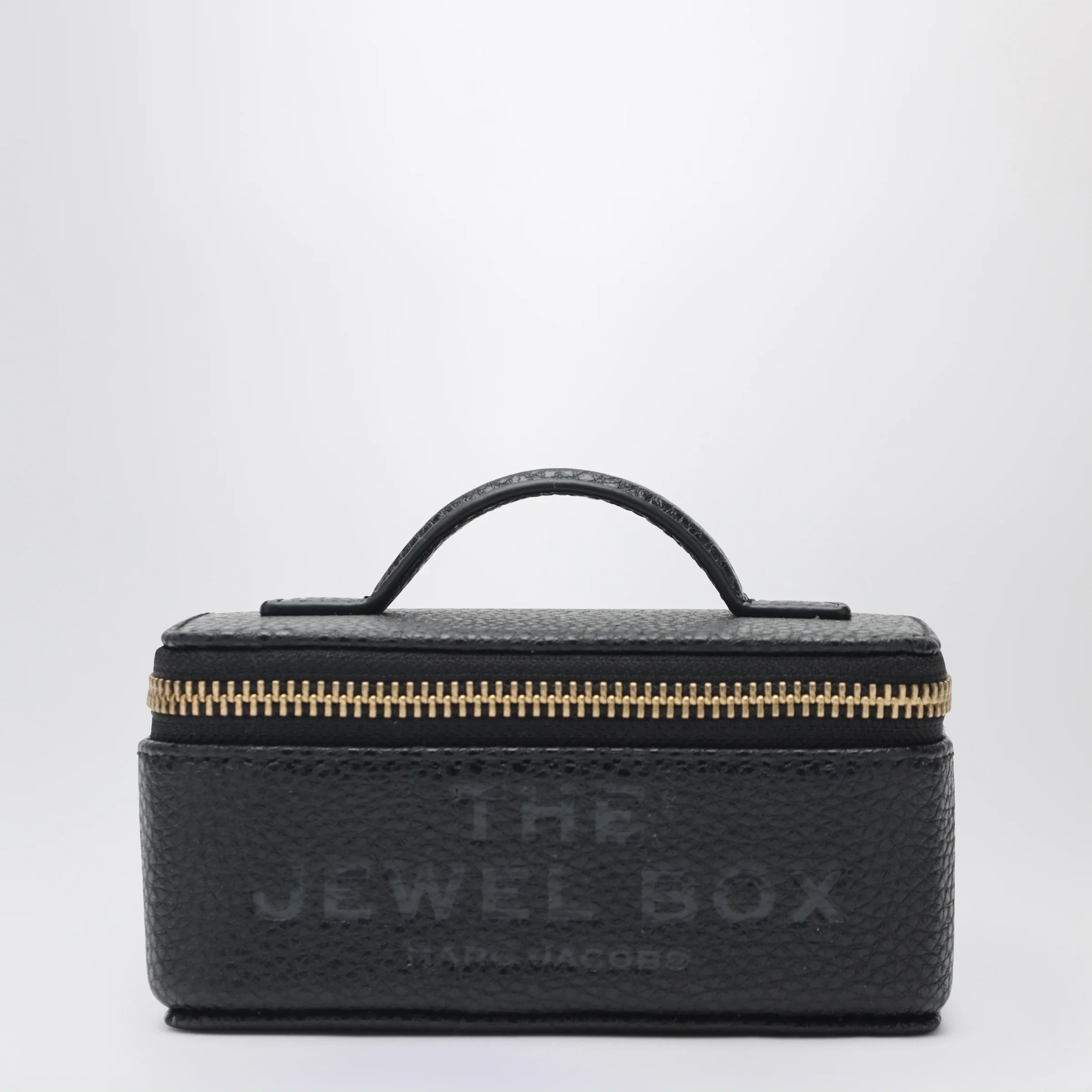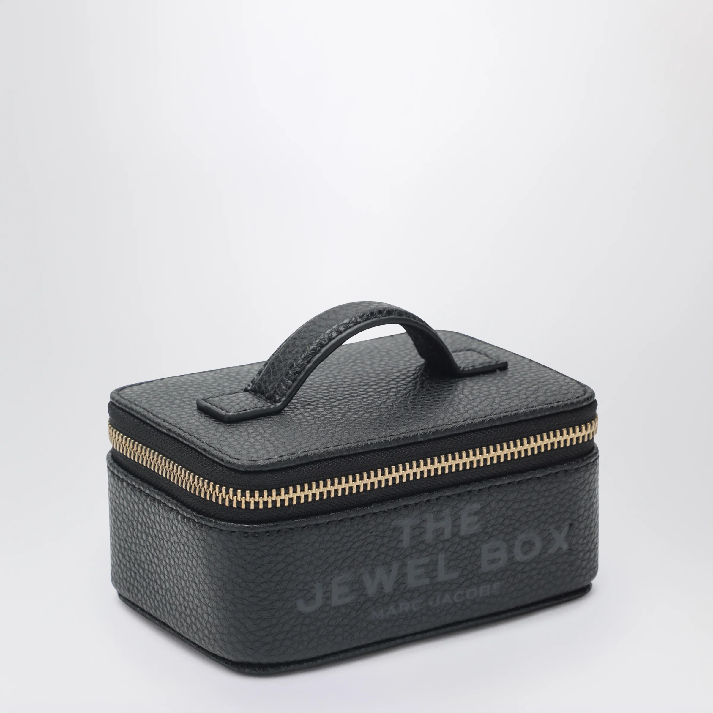 Jewelry case by Marc Jacobs in black textured grained leather Zip closure Five structured compartments Built in mirror One top handle. Size and Fit – Width 13 cm x Height 9 cm x Depth 6 cm