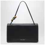 Marc Jacobs bag in smooth black leather, featuring flap with turn-lock logo closure, top handle with interlaced J logo detail, one internal zip pocket, contrasting nappa lining, contrasting embossed logo lettering on the back, and gold-tone metal hardware.