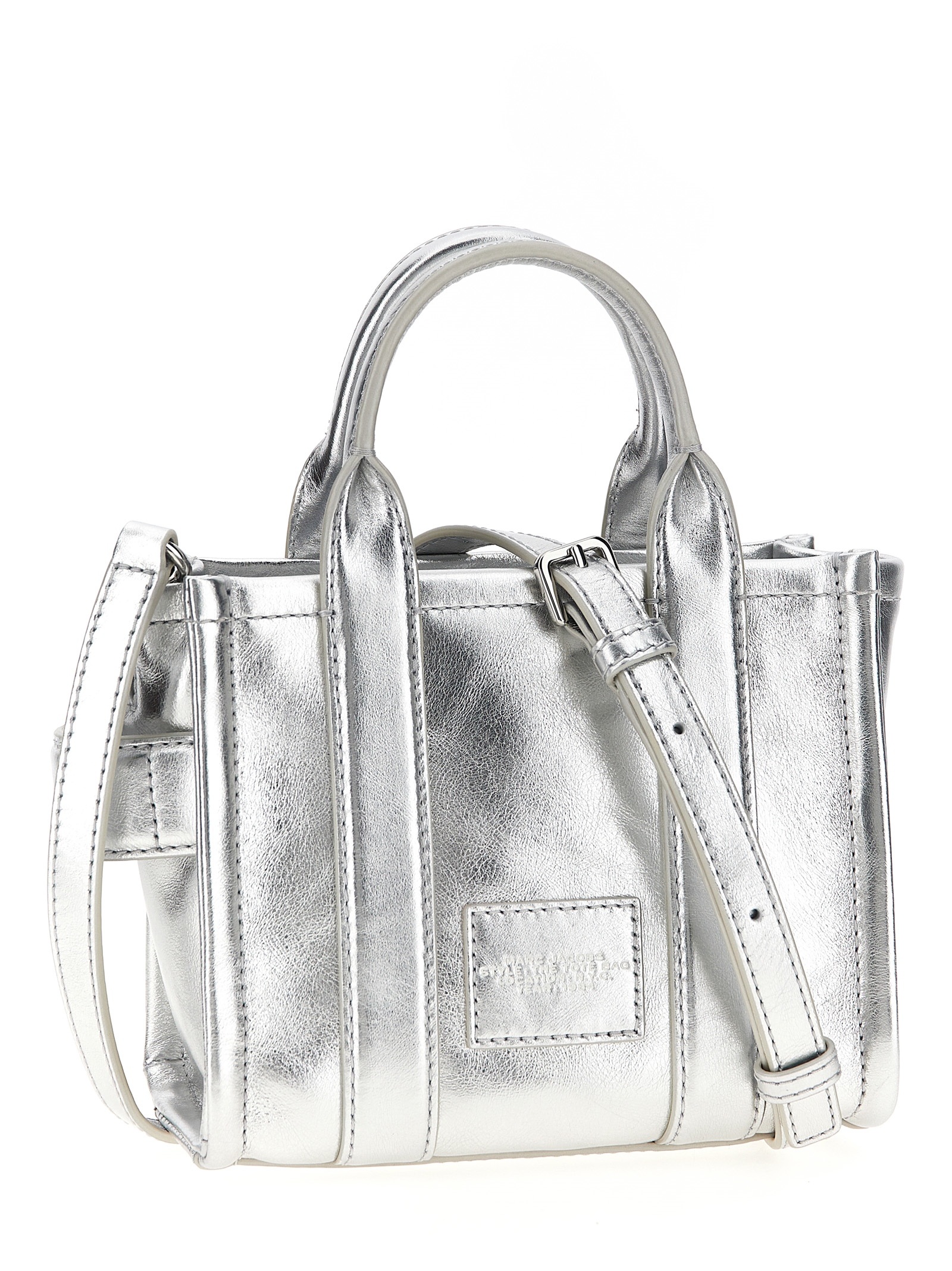 ‘The Metallic Leather Crossbody Tote’ metallic leather crossbody bag with front embossed logo, double fixed handle, zip closure, adjustable and removable shoulder strap.